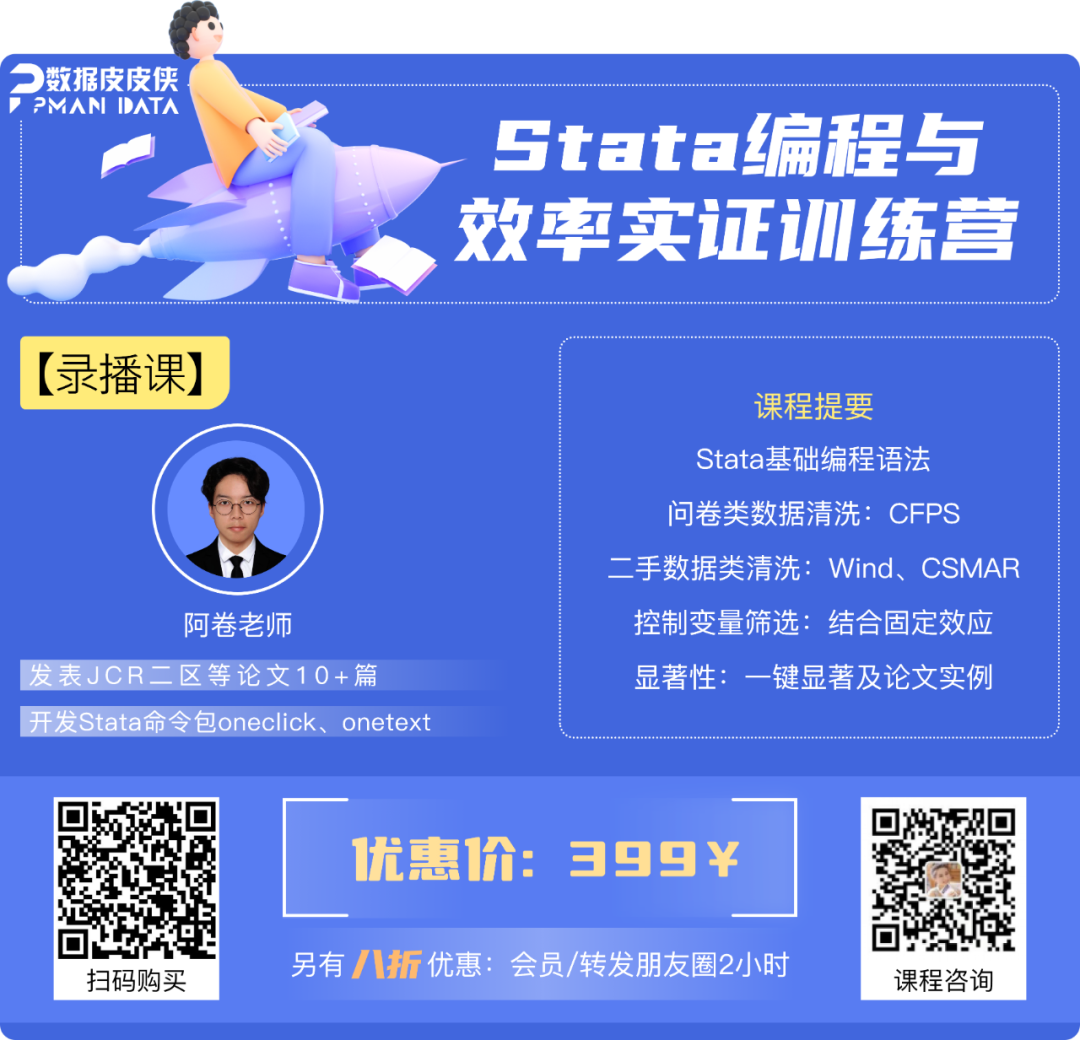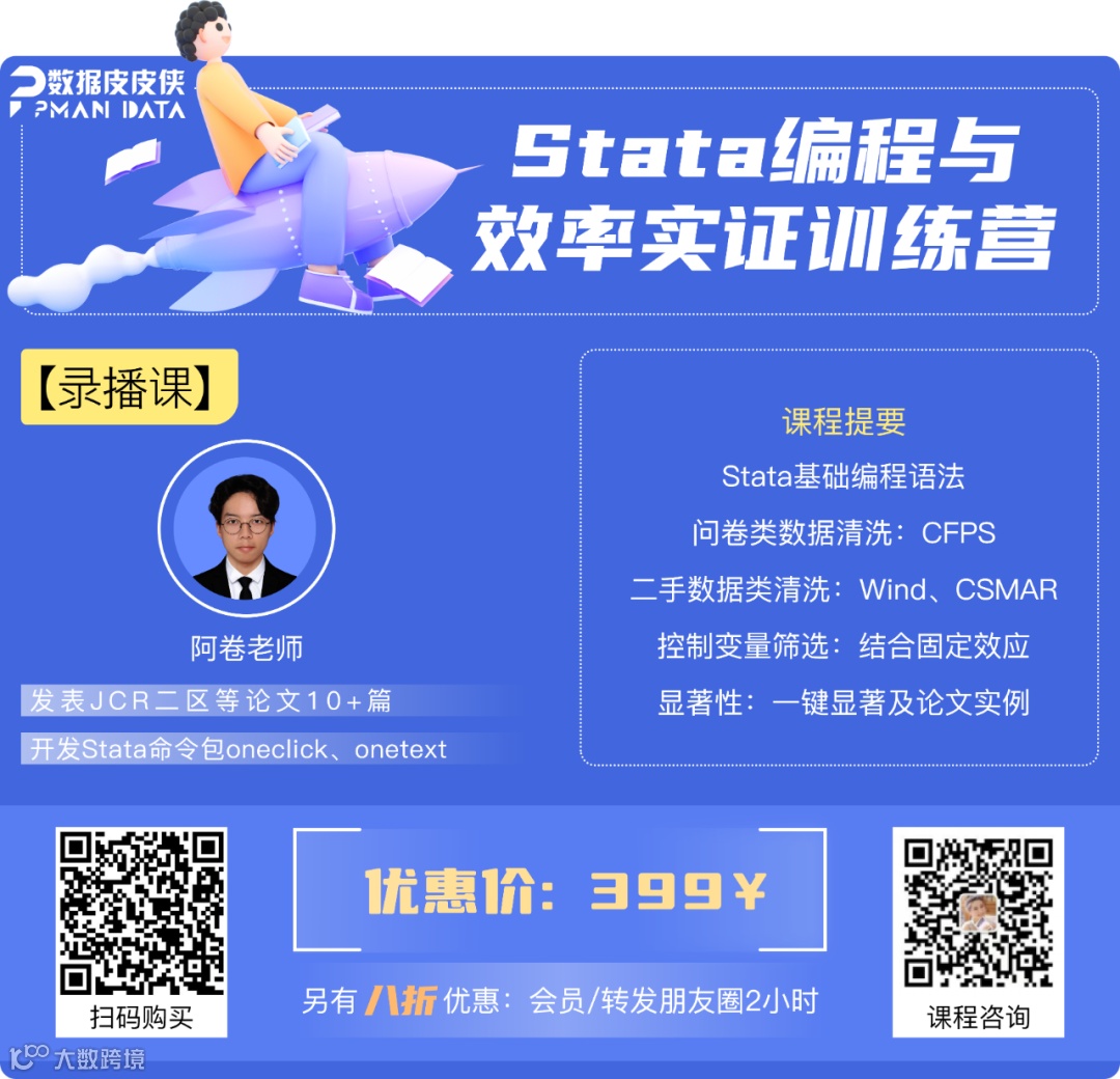 PPdata Academy结合社科实证数据处理的实际经验,精心设计《Stata编程与效率实证训练营》课程,涵盖基础编程语法,问卷数据、二手数据等实际清洗案例,控制变量筛选、显著性控制等关键数据处理环节,致力提升实证研究效率,成为实证研究者的必备利器!