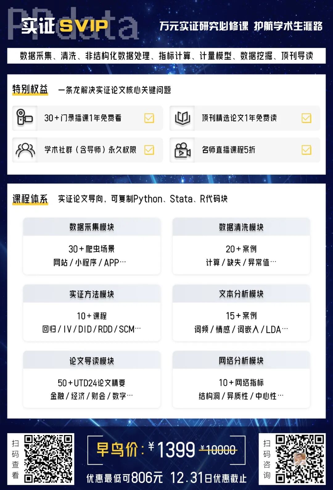涵盖多源数据采集、数据清洗、基于非结构数据的指标构建、指标计算、模型构建、解读分析、顶刊导读,主打Python、Stata、R三种社科常用数据分析编程语言。