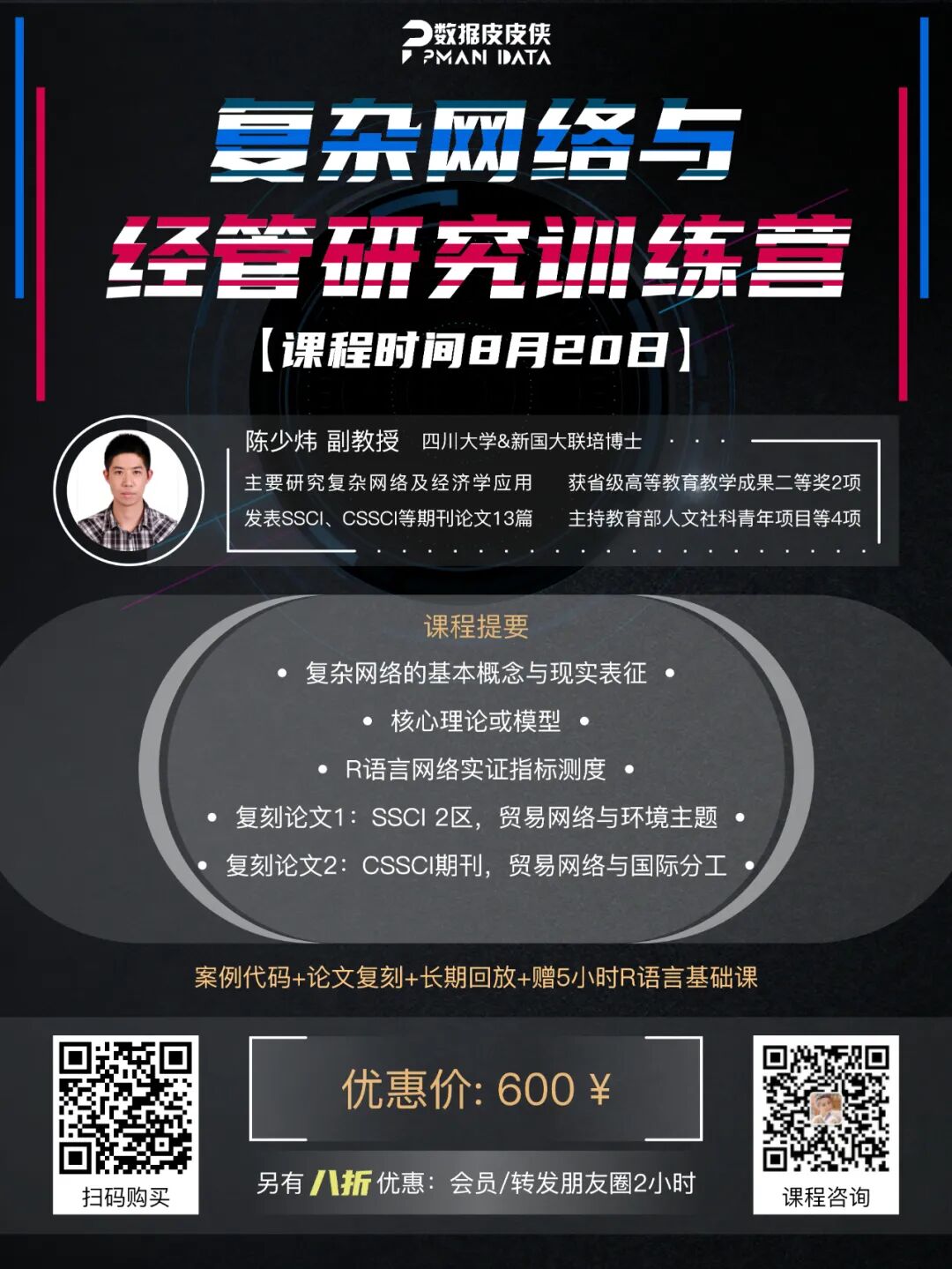 掌握高效的网络数据处理方法,可以打开经管乃至社科学者的研究思路,匹配优质期刊的对于高质量实证数据的要求。为此我们专门开发了《复杂网络与经济学应用研究科研训练营》,通过基础讲解,论文复刻,帮助大家掌握该研究方法。