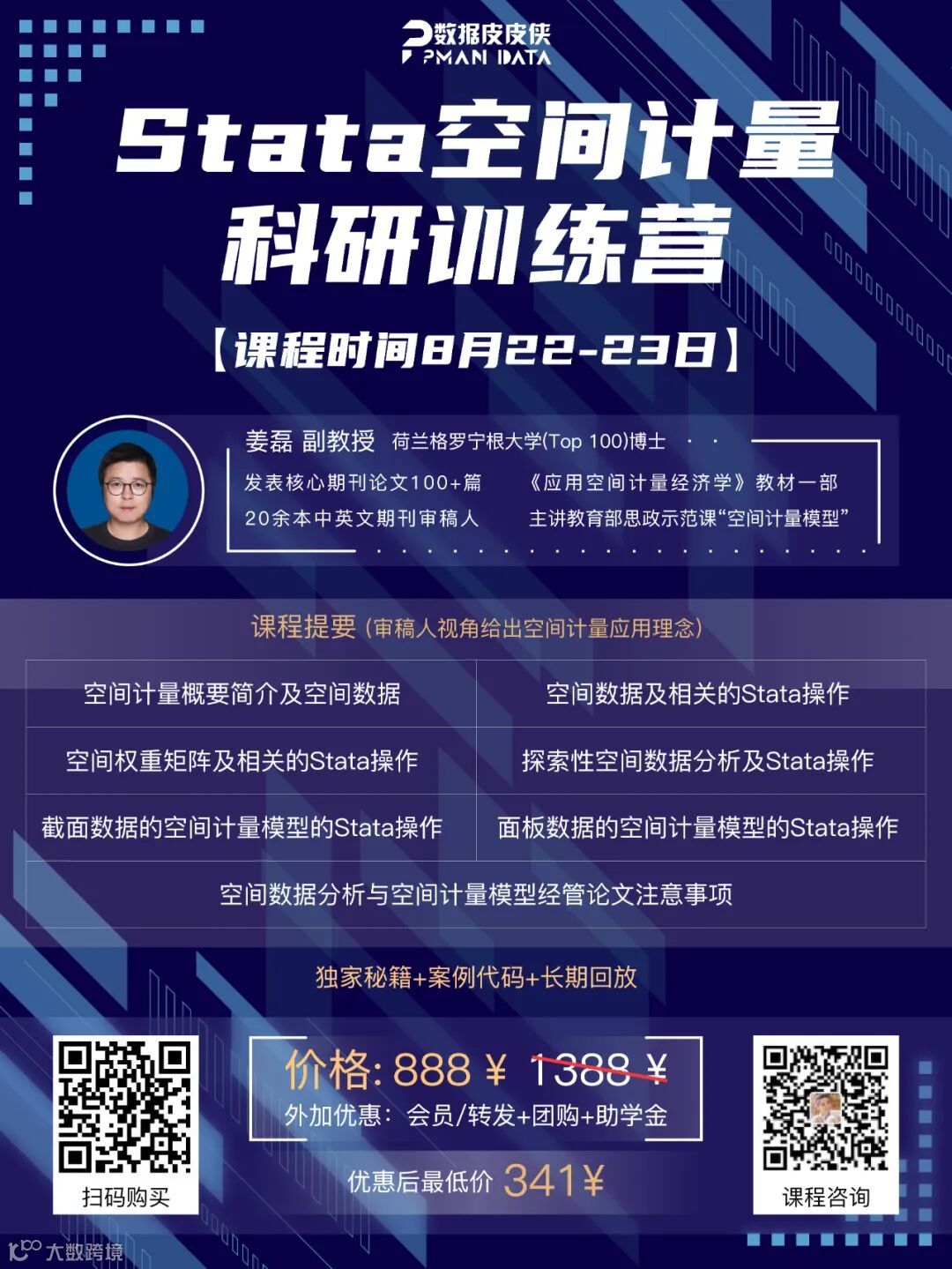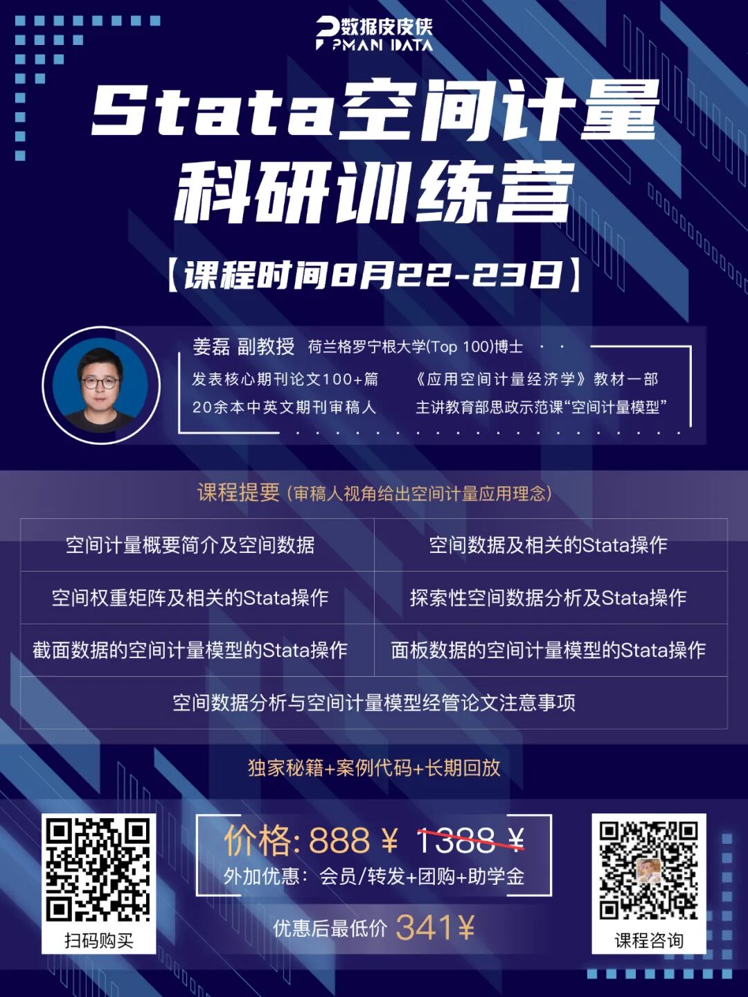 姜磊副教授(详见后文“授课老师”)师承国际前沿、深耕空间计量研究,发表中英文论文100余篇,在20多本中英文期刊审稿工作,审稿论文数百篇,深知各领域研究者在空间计量模型应用方面的问题甚至痛点,特基于Stata开发兼具空间计量理论与论文应用的《Stata空间计量科研训练营》,帮助大家不仅学会Stata操作并解释模型结果,更深刻认识空间效应、理念,以更好应用于自己的实证研究。同时我们设置了科学化的课程机制,帮助学员熟练掌握空间计量模型方法撰写实证论文: