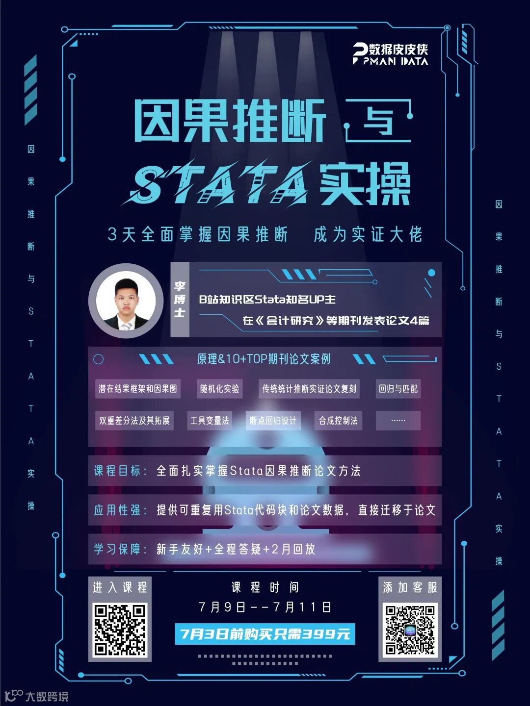2021年诺奖得主Card、Angrist以及Imbens开启了因果推断的新时代,实证研究逐渐从“数星星”的传统统计推断时代到更加重视研究设计以及因果关系的因果推断时代,潜在结果框架、随机化实验、匹配、双重差分、工具变量、断点回归、合成控制成为当前实证研究的新宠,为使研究者熟悉因果推断的基本思想以及掌握可供实操的Stata代码,特开发本课程: