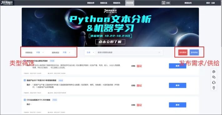 项目供需:如果你有急需的数据或是想要要把手中的精品数据有偿分享,就可以在这个板块发布供给/需求。