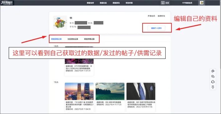 个人主页:把鼠标放在头像上就可以进入个人主页,这里可以看到自己获取过的数据/发过的贴子以及供需记录。也可以点击编辑资料,更换头像或是更换绑定的手机号。