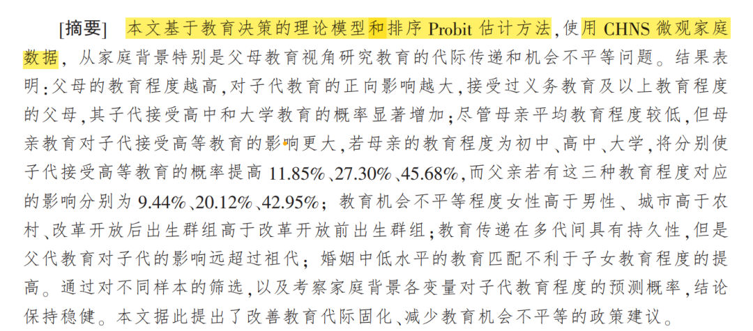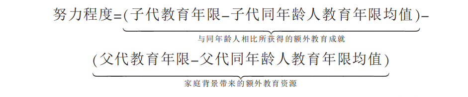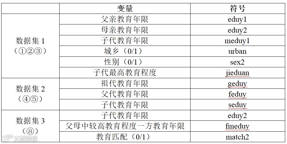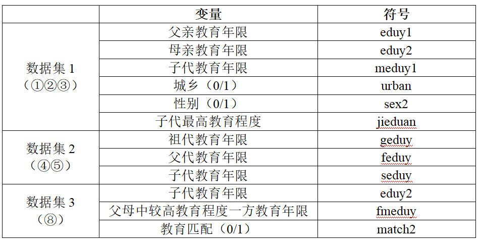 其中, 代表个体 的潜在最优教育程度,而为随机干扰项,估计方程中 代表父亲的教育程度, 代表母亲的教育程度,代表其他影响子代教育程度的个体特征和家庭背景等控制变量。