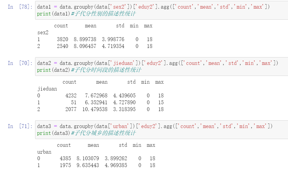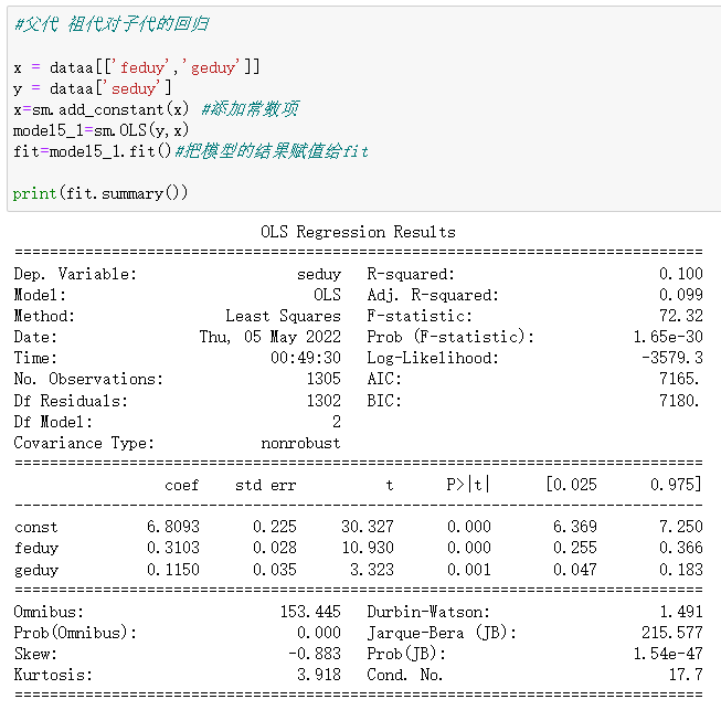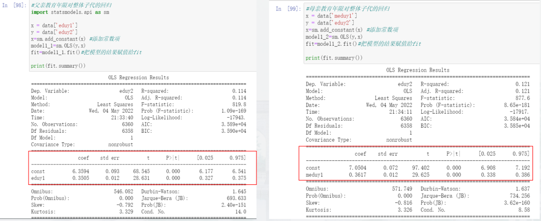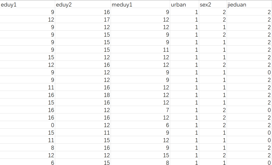 从回归2可以看出家庭收入和社会地位的影响为正,父亲职业越高,其对子代教育程度的影响越大;且随着收入的加入,父母教育程度对子代教育的影响有所减弱。