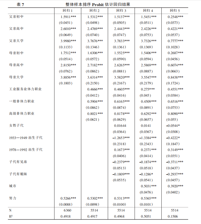 从回归4可以看出子代教育程度受城乡差异影响,相比农村,城市地区子代教育程度上升的概率更大。