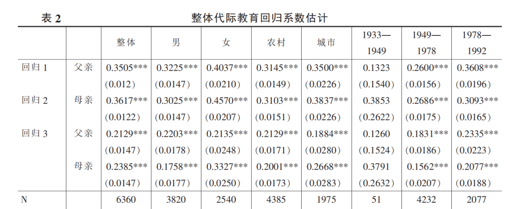 (1)利用代际教育回归系数来测算父代和子代之间教育程度的变动状况(数据集1)