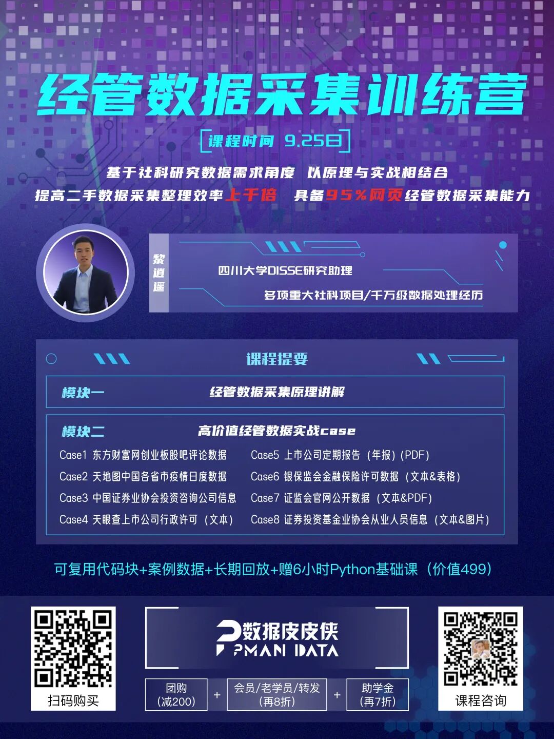 因此我们从社科研究数据需求出发,帮助大家掌握爬虫方法,使得人工几十天整理的数据几小时就能采集完毕,提高二手数据采集整理效率千百倍: