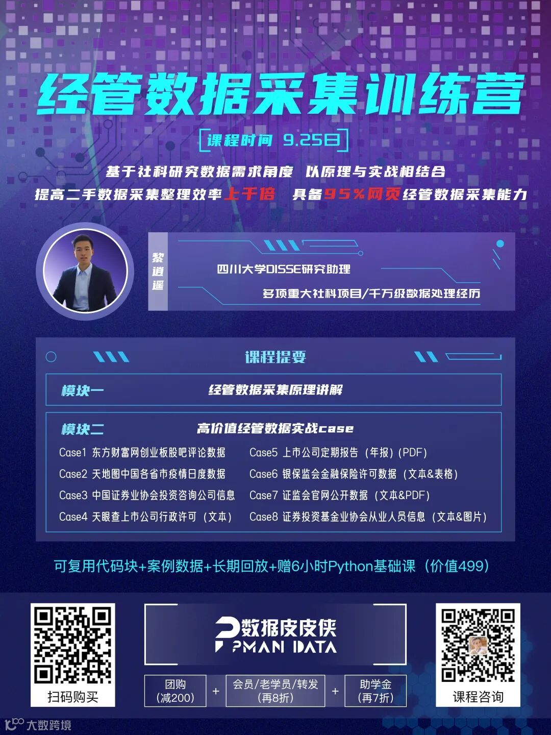 对于经管学者而言,科研数据对实证研究意义重大。各类经济金融数据以文本、图片、PDF等非结构化、异构型数据格式存储于海量的网页中。