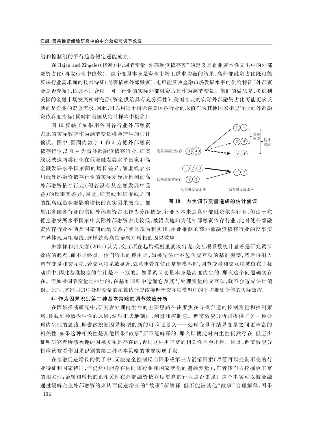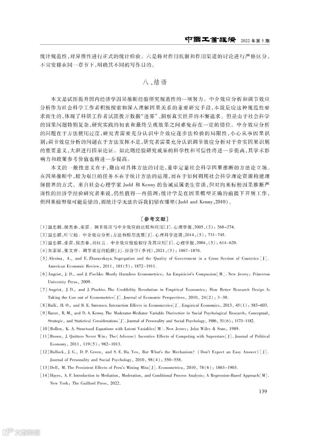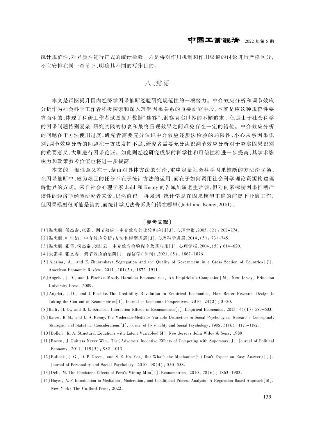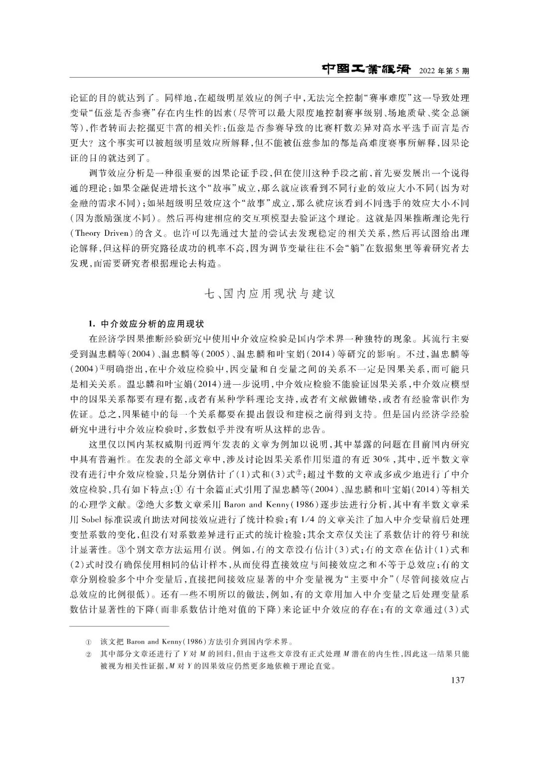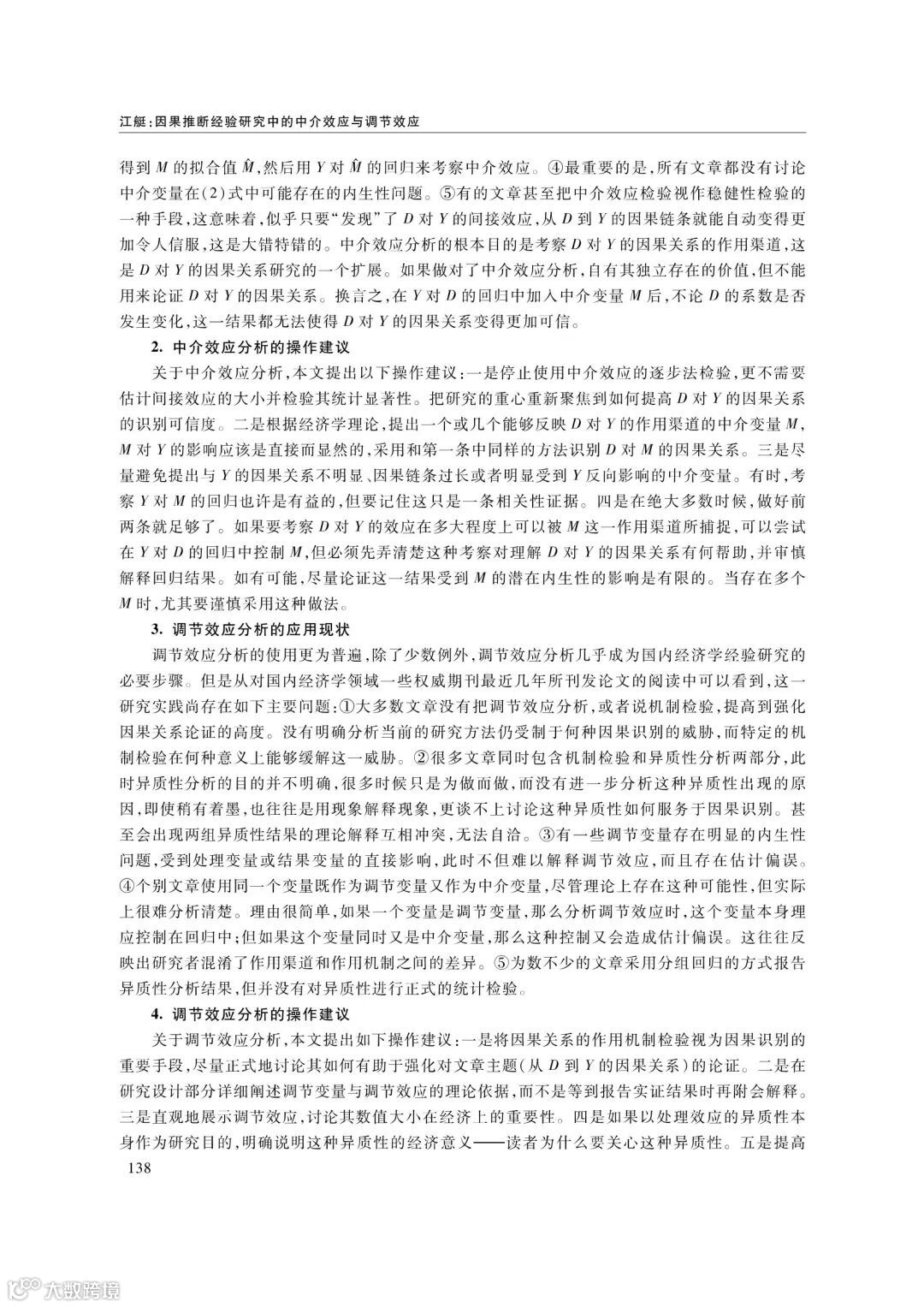 【摘要】中介效应分析与调节效应分析是国内经济学因果推断经验研究中被广泛采用的两种研究手段,但是存在不同程度的误用。前者的主要问题在于过度使用中介效应逐步法检验,后者的主要问题是对其在因果识别中的作用阐发不足。为此,本文深入讨论了中介效应检验的偏误、如何正确开展中介效应分析,以及如何使用调节效应分析来强化因果关系论证,并针对当前的使用现状提出了相应的操作建议。
