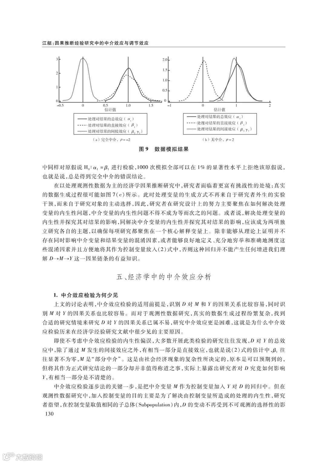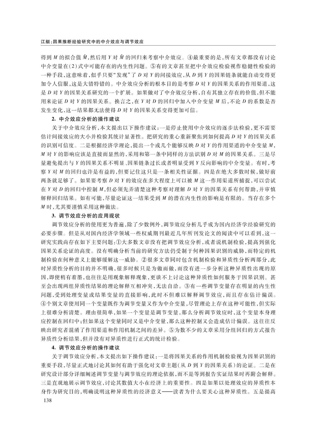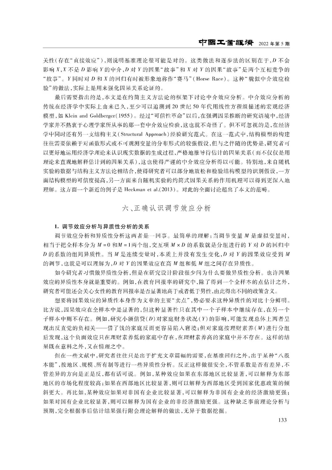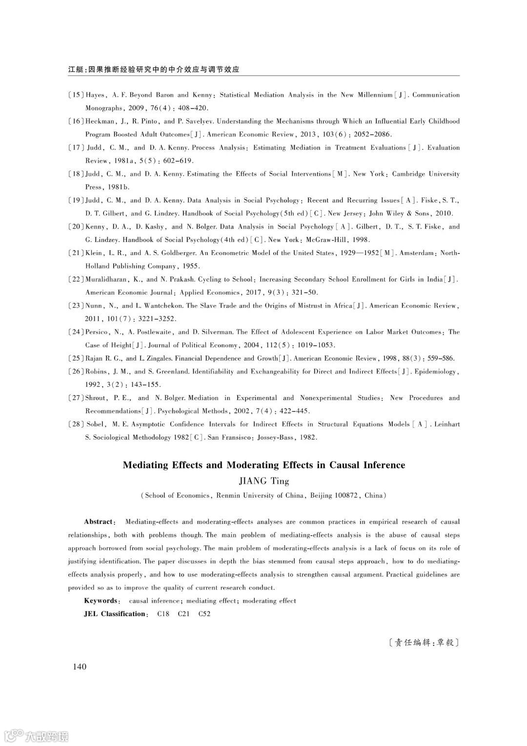 【摘要】中介效应分析与调节效应分析是国内经济学因果推断经验研究中被广泛采用的两种研究手段,但是存在不同程度的误用。前者的主要问题在于过度使用中介效应逐步法检验,后者的主要问题是对其在因果识别中的作用阐发不足。为此,本文深入讨论了中介效应检验的偏误、如何正确开展中介效应分析,以及如何使用调节效应分析来强化因果关系论证,并针对当前的使用现状提出了相应的操作建议。