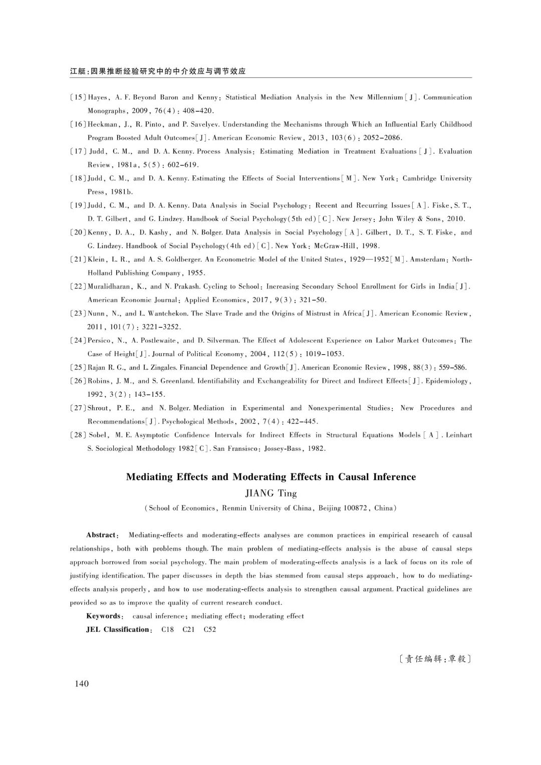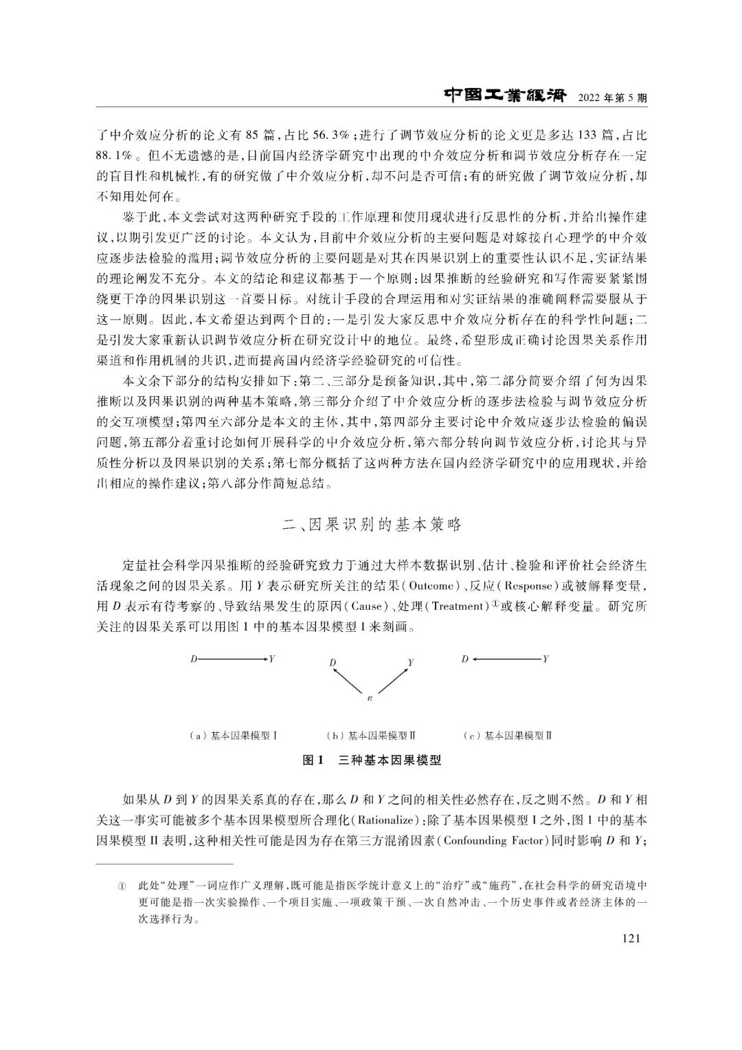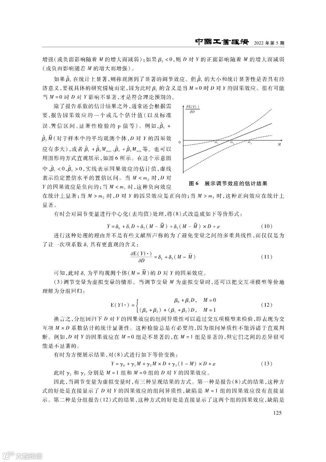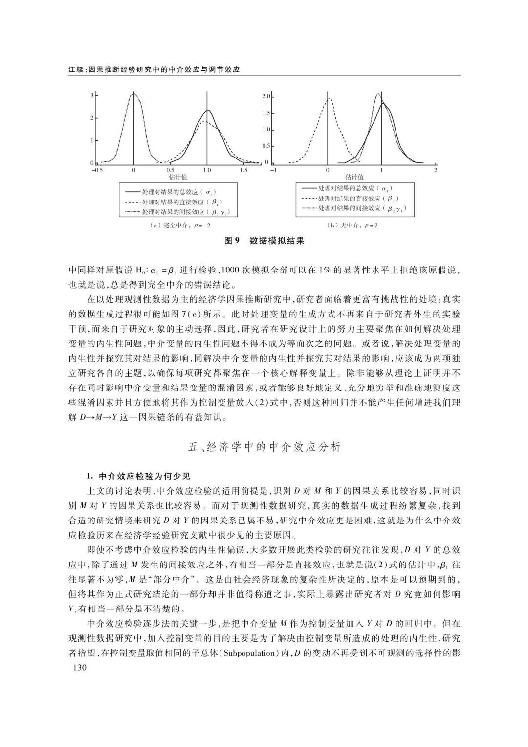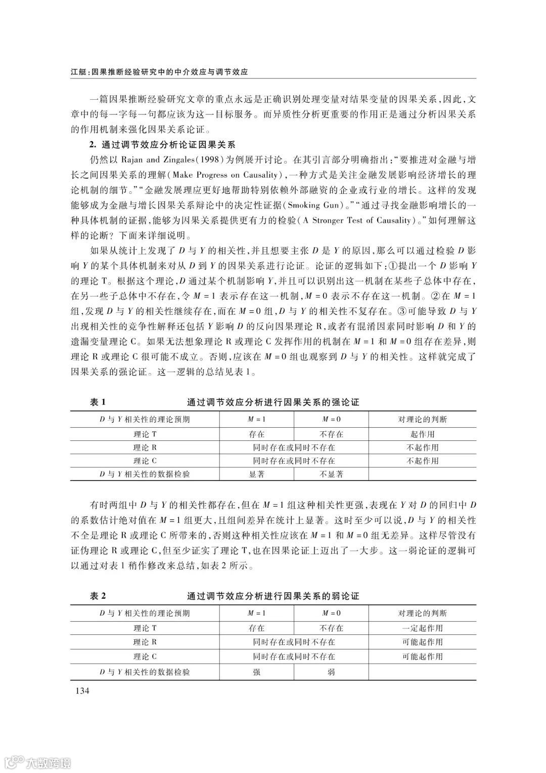 【摘要】中介效应分析与调节效应分析是国内经济学因果推断经验研究中被广泛采用的两种研究手段,但是存在不同程度的误用。前者的主要问题在于过度使用中介效应逐步法检验,后者的主要问题是对其在因果识别中的作用阐发不足。为此,本文深入讨论了中介效应检验的偏误、如何正确开展中介效应分析,以及如何使用调节效应分析来强化因果关系论证,并针对当前的使用现状提出了相应的操作建议。