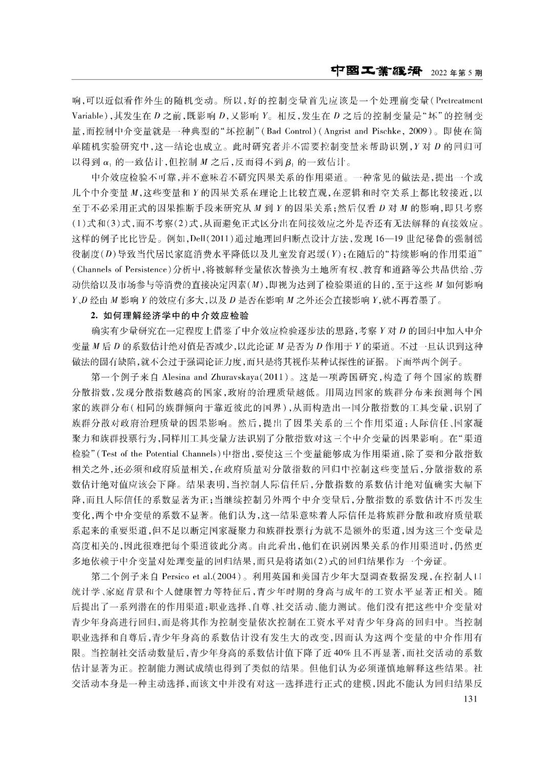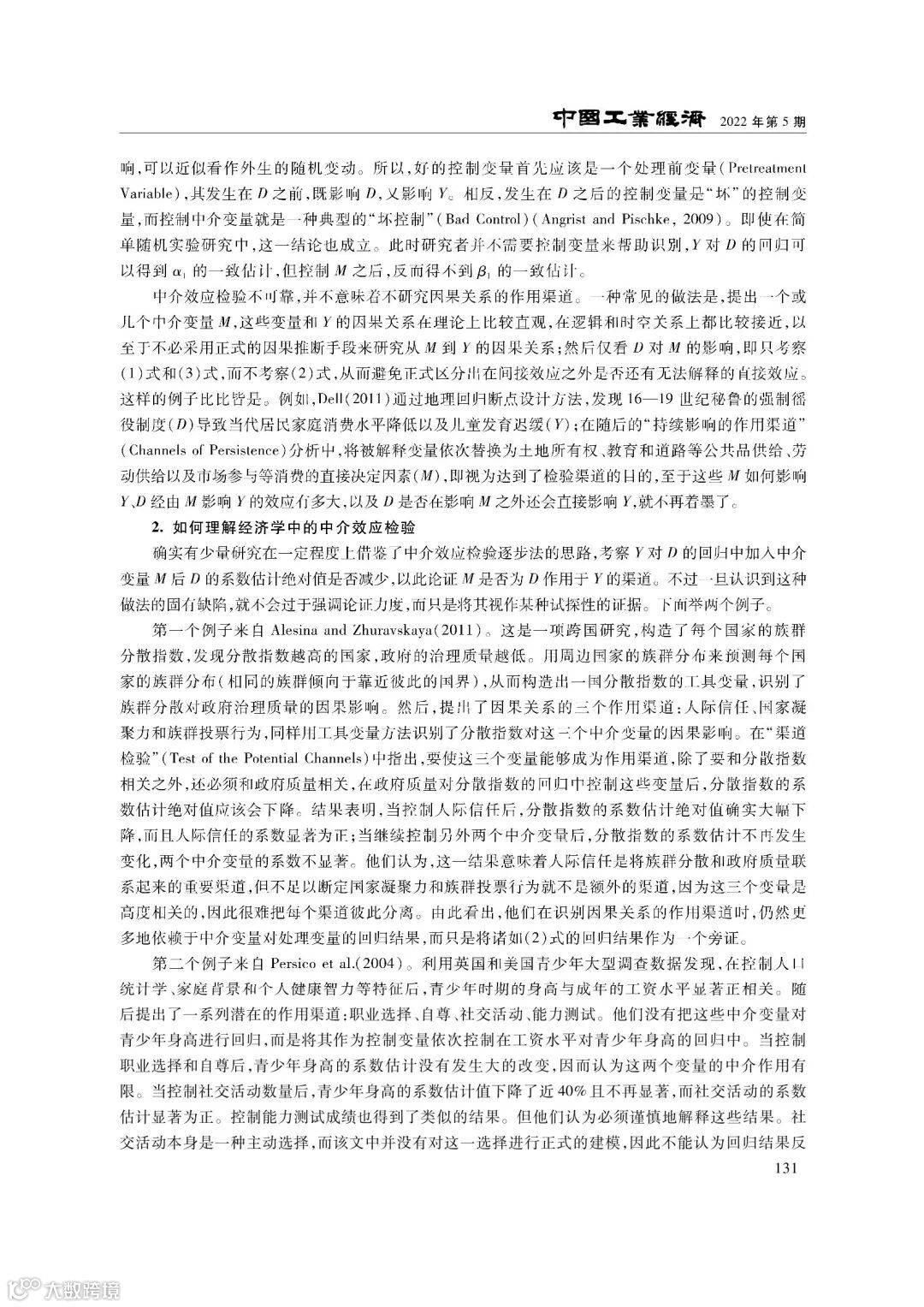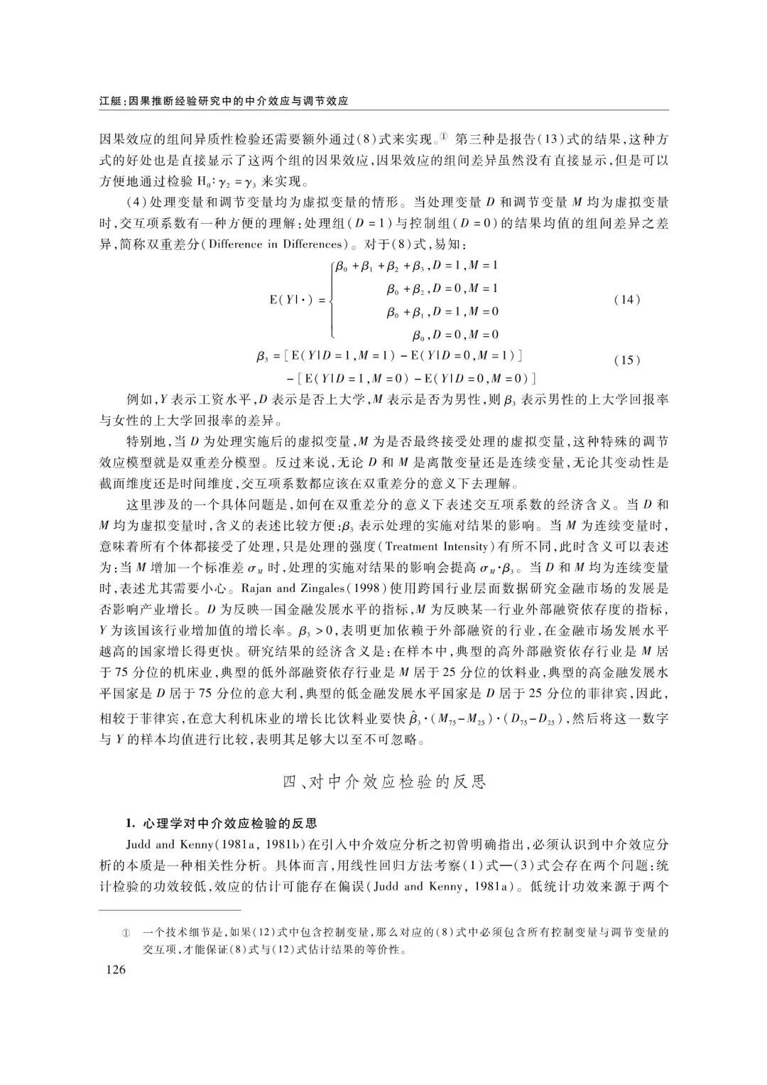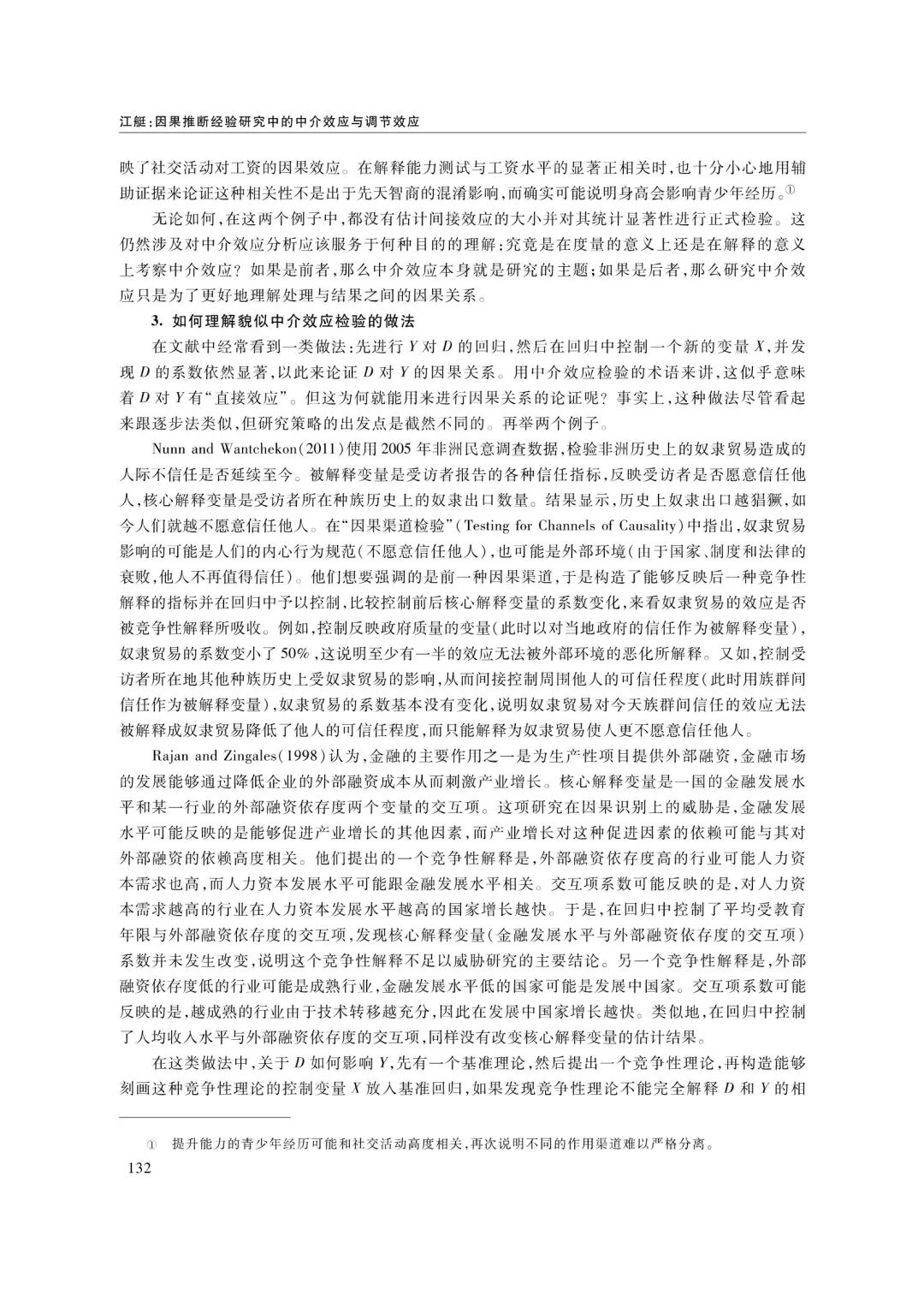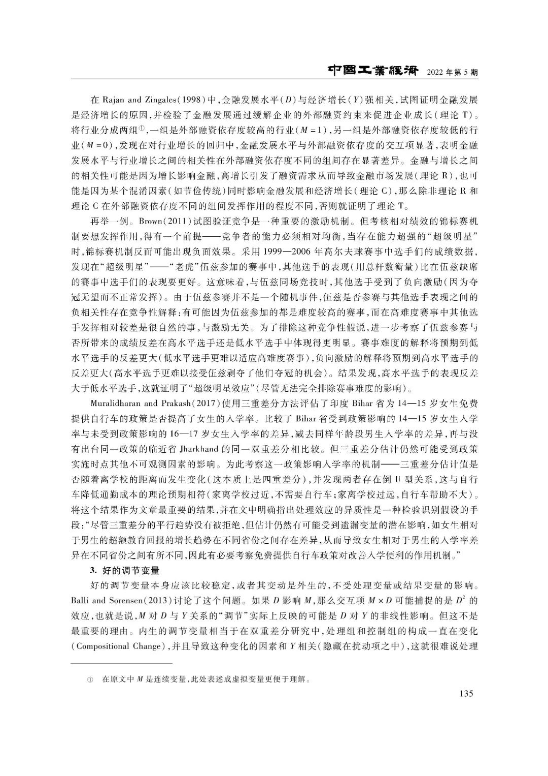 【摘要】中介效应分析与调节效应分析是国内经济学因果推断经验研究中被广泛采用的两种研究手段,但是存在不同程度的误用。前者的主要问题在于过度使用中介效应逐步法检验,后者的主要问题是对其在因果识别中的作用阐发不足。为此,本文深入讨论了中介效应检验的偏误、如何正确开展中介效应分析,以及如何使用调节效应分析来强化因果关系论证,并针对当前的使用现状提出了相应的操作建议。