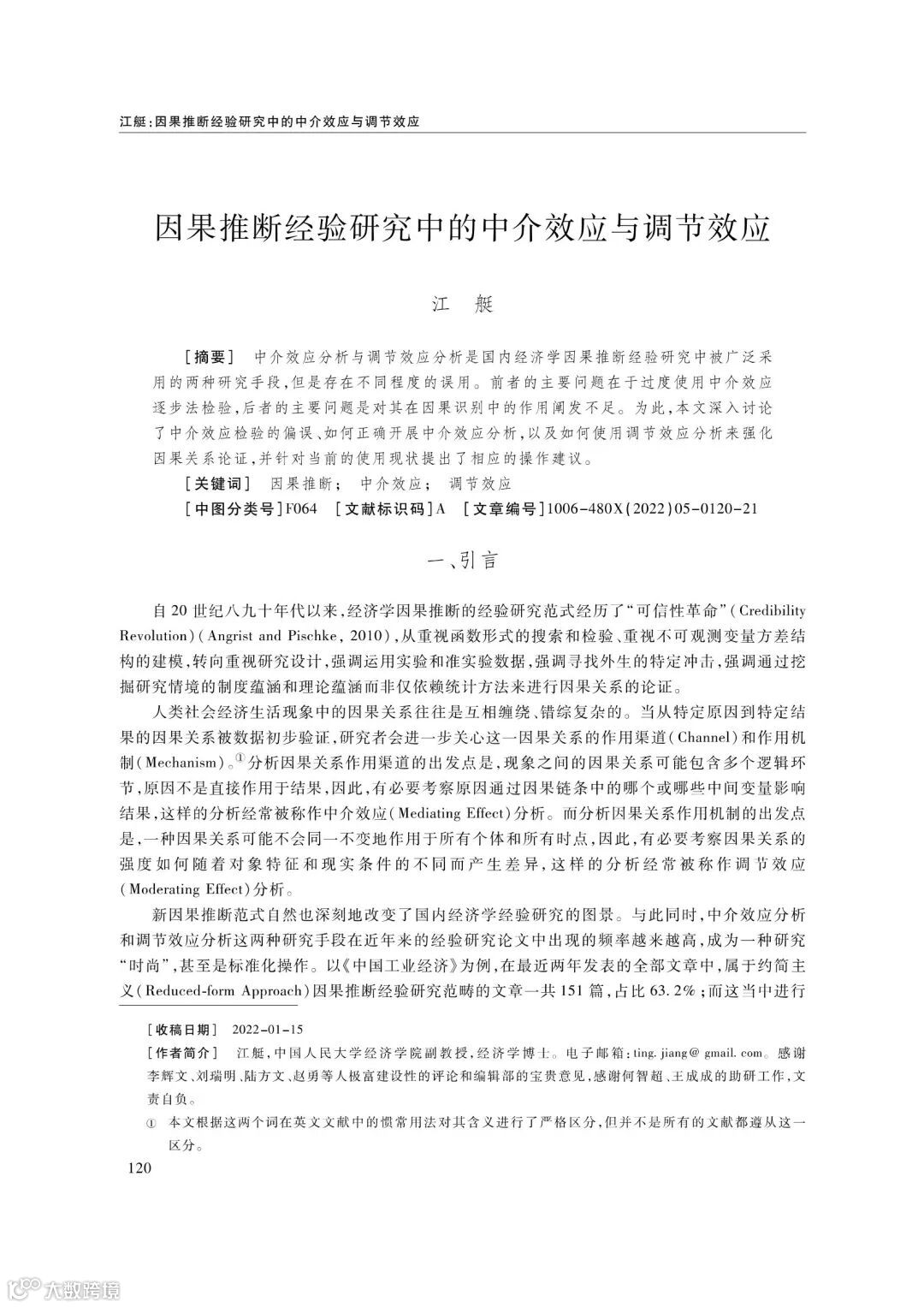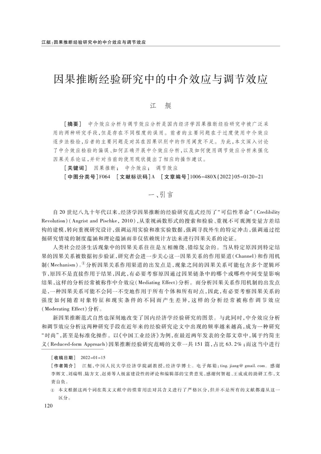 江艇.因果推断经验研究中的中介效应与调节效应[J].中国工业经济.2022. http://ciejournal.ajcass.org/Magazine/Show?id=83059