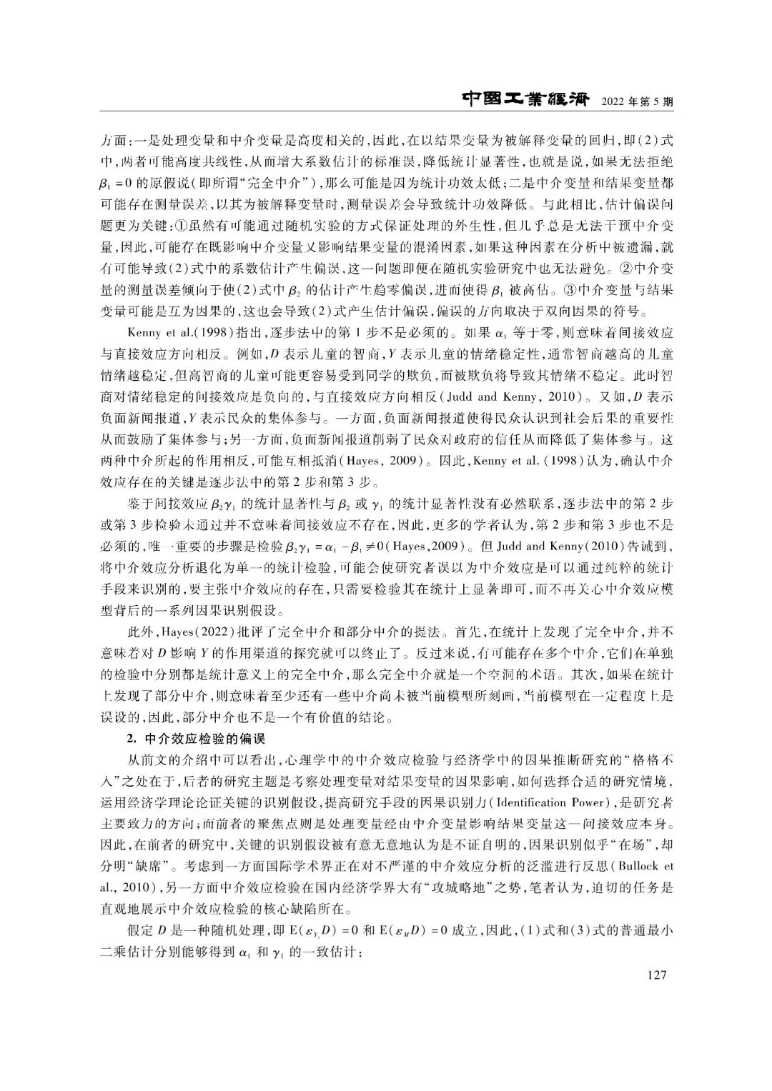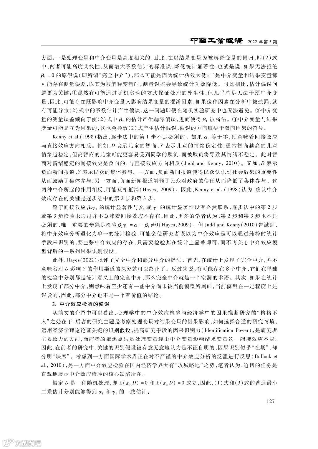 最近两年,中介效应引起了经济学界的广泛讨论,中国工业经济在2022年第5期,刊发了中国人民大学江艇老师中介与调节效应的文章,值得学习与阅读(该论文目前尚未被知网收录)。