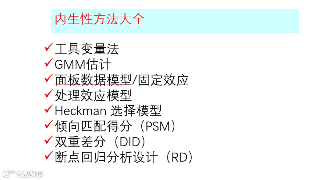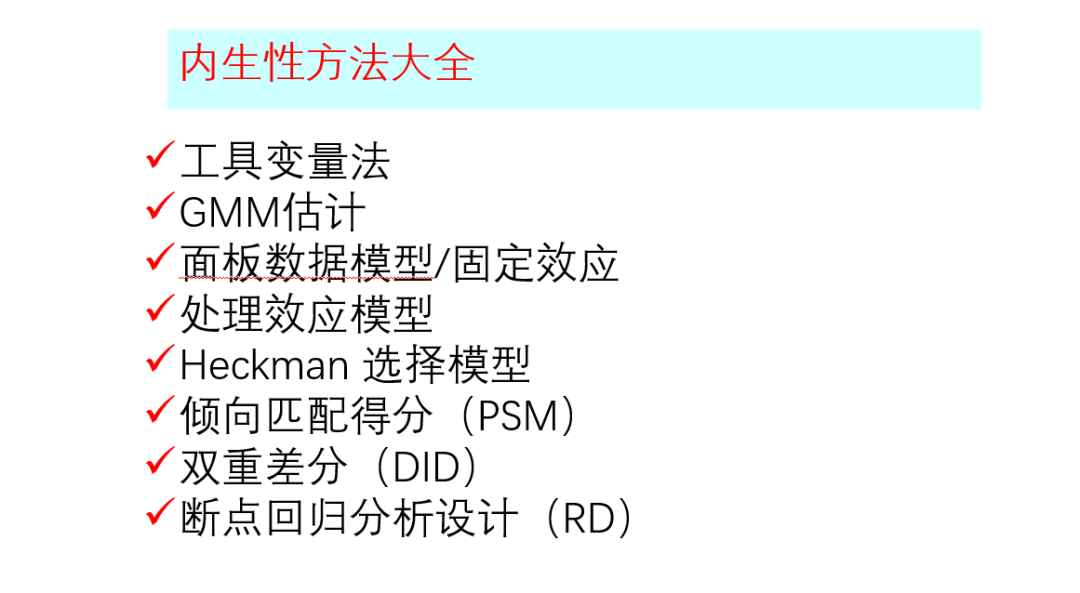 解决内生性问题的常见方法,主要包括工具变量( instrumental variable,简称IV) 、固定效应模型( fixed effects model,简称FE) 、倾向值匹配( propensity score matching,简称PSM) 、实验以及准实验( experimentsand quasi-experiments) 等等。首先我们来看工具变量法。