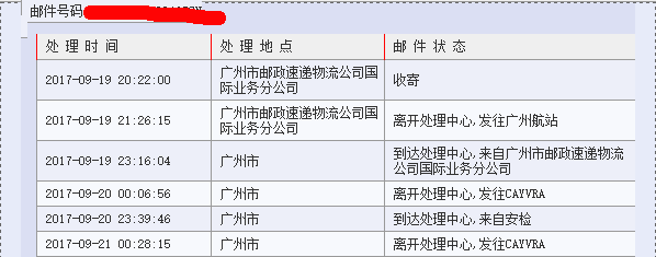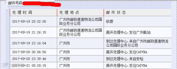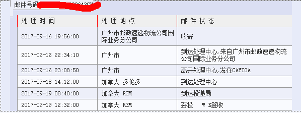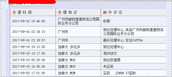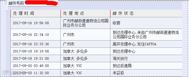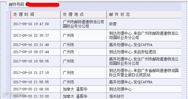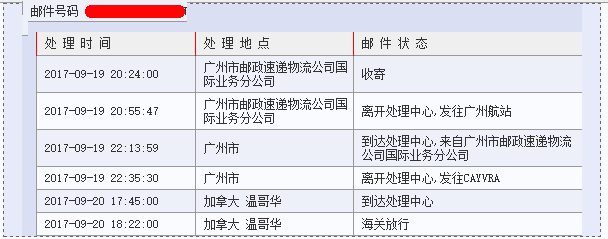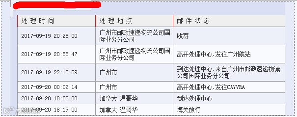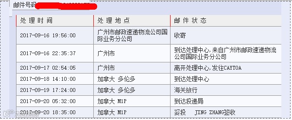事件描述:此包裹在北京时间2017-09-19 20:24:00从《金跃航国际快递集运中心》通过EMS快递发出,在2017-09-20 18:22:00 已由加拿大-温哥华海关放行,用时:22小时。