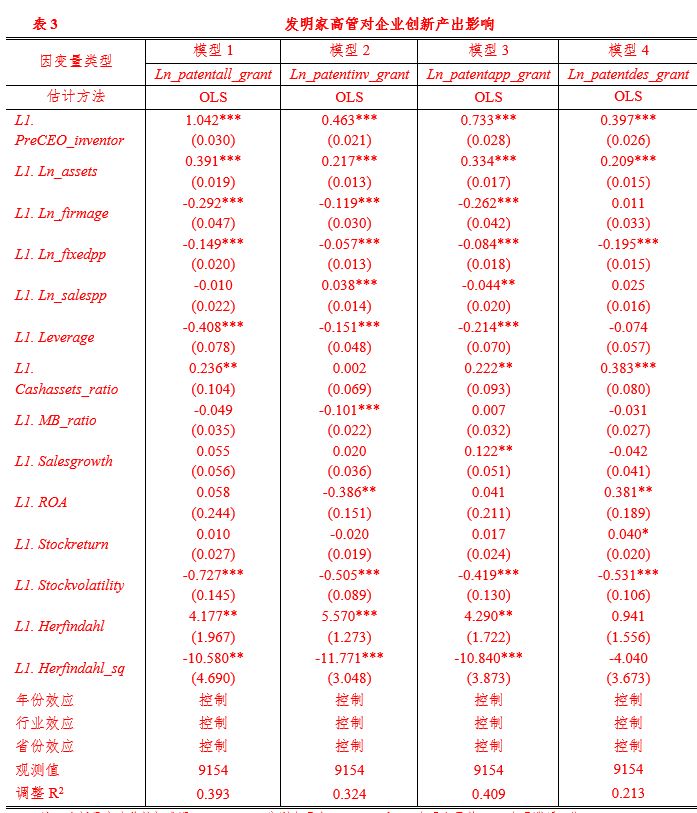 研究假设1:高管发明家经历提高企业研发投入强度。研发投入提高并不必然带来创新产出和创新效率的提高(Aghion et al.,2013)。首先,发明家高管有利于提高管理层的背景多样性,具有发明家背景的高管倾向于以不同于其他背景高管的方式思考问题,并能在企业管理过程中提供不同的观点,提高企业管理层的多样性(Francis et al.,2015),Talke et al.(2010)以及Østergaard et al.(2011)通过实证研究发现,企业管理层的多样性能够显著提高企业创新产出。其次,发明家高管作为本领域的技术专家,凭借其专业知识,对行业和前沿技术的理解,能够实现研发资源的优化配置,避免无效和低效创新浪费宝贵的研发投入,进而提高企业研发成功率和研发效率。Audretsch and Lehmann(2006)研究发现,专家型董事可以通过促进对外部知识溢出的获取和吸收来增强企业的竞争优势。此外,Kaplan et al.(2012)和Bernile et al.(2017)认为,企业高管个人经历向企业内部和外部都传递出明显的信号。发明家高管对企业内部个体发明家来说是一个明显的激励信号,激励企业内部个体发明家努力工作,提高其创新效率和创新参与,而企业内部发明家又是企业从事技术创新活动的主要群体,个体发明家创新产出与创新意愿提高又会推动企业整体技术创新水平提高。综上所述,提出本文的第二个和第三个研究假设:研究假设2:高管发明家经历不仅提高企业研发投入,而且提高企业创新产出。研究假设3:高管发明家经历不仅提高研发投入和创新产出,还进一步提高企业创新效率。 三个理论假说的实证检验如下: 1. 基准模型估计结果首先,从研发投入方面分析发明家高管的“创新效应”,表2所示即为发明家高管对企业研发投入强度的多元回归估计结果。由表2模型1可知,仅考虑发明家高管对企业研发投入强度的影响,发明家高管的回归系数约为0.007,且在1%水平上显著。控制企业基本信息和财务特征后,发明家高管的回归系数降至0.006,仍然在1%水平上显著(见表2模型2)。表2模型3和模型4又进一步控制了企业盈利能力以及相关市场化指标,发明家高管的回归系数不改变,仍然为0.006,且在1%水平上显著。表明高管发明家经历与企业研发投入强度之间存在显著的正相关关系,当期高管发明家经历使得企业下一年研发投入强度平均提高约0.6个百分点,发明家高管对企业研发投入的促进作用不论在统计意义上,还是在经济意义上都较为明显,验证了第一个研究假设。其他控制变量中,企业资本密集度和现金持有的系数显著为正,说明资本密集型,以及现金较充裕的企业,研发投入强度较高。另一方面,企业规模、年龄、杠杆率,以及市账率对企业研发投入强度影响均显著为负,意味着,资产规模越大、成立时间越久、杠杆率及市账率越高的企业,研发投入强度反而越低。 创新产出方面,本文主要采用企业当年所申请的专利中最终获得授权的专利数量作为企业创新产出的代理变量。由于不同类型专利价值不同,因此,本文分别考察发明家高管对企业专利授权总量、发明专利授权量、实用新型专利授权量以及外观设计专利授权量的影响,不仅分析发明家高管对企业创新专利产出总量的影响,同时也考虑到其对不同类型专利授权量的具体效应。表3详细汇报了发明家高管对企业创新专利产出的具体效应,表3模型1至模型4中被解释变量分别为企业专利授权总量以及发明、实用新型、外观设计三种类型专利授权量,采用最小二乘估计方法。由表3模型1估计结果可知,发明家高管对企业专利授权总量的估计系数为1.042,且在1%水平上显著,意味着高管发明家背景使得企业下一年专利授权总量平均增加约104.2%,超过一倍,这种正向促进效应不论是在经济意义上,还是在统计意义上都比较显著。根据表3模型2至模型4估计结果,发明家高管对企业发明专利授权量、实用新型专利授权量以及外观设计专利授权量的估计系数分别为0.463、0.733和0.397,均在1%水平上显著,表明高管发明家经历使得企业下一年发明专利授权量、实用新型专利授权量和外观设计专利授权量分别平均增加约46.3%、73.3%和39.7%,发明家高管对三种类型专利授权量的正向促进影响均比较明显。也即第二个研究假设得以验证。控制变量方面,企业总资产、现金资产比率对企业创新专利产出的影响显著为正,说明规模越大、现金越充裕的企业,创新产出也越多,技术创新是一项高风险、高投入活动,规模较大、现金充裕的企业才能承担技术创新的高昂成本。另一方面。企业人均固定资产净额越高,创新产出反而越少,说明对于企业创新而言,资本密度并非越高越好。企业股票日收益率标准差估计系数显著为负,表明企业股票收益波动越大,越不利于创新。企业所在行业赫芬达尔指数估计系数显著为正,赫芬达尔指数平方项的估计系数显著为负,说明市场竞争程度对企业创新的影响呈现出“倒U型”关系,即当市场竞争程度较低时,竞争有利于企业创新,而当市场竞争程度超过一定限度时,竞争反而不利于企业创新。以上控制变量的回归结果基本符合理论预期,与大部分已有研究结果相一致。 不仅是创新产出,创新效率也是企业所必须重视的问题,创新效率体现出企业对创新投入的利用是否高效。本文不仅关注发明家高管对企业创新产出的影响,同时考虑到发明家高管对企业创新效率的影响,本文参考Hirshleifer et al.(2013),定义企