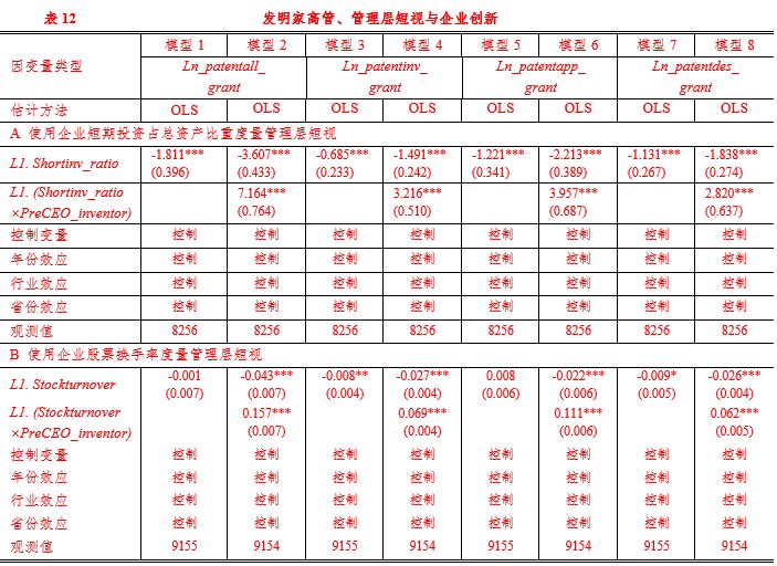 研究假设1:发明家高管拥有专业知识和一线研发经验,对创新过程和创新趋势理解深刻,拥有发明家经历高管会提升企业创新质量。管理多元化假说(the diversity hypothesis)。Talke et al.(2010)以及 Østergaard et al.(2011)通过实证研究发现,企业管理层的多样性有利于企业创新。具有发明家背景的高管倾向于以不同于其他背景高管的方式思考问题,并能在企业管理过程中提供不同的观点,提高企业管理层的多样性(Francis et al.,2015)。对于公众上市企业,管理层短视(managerial myopia)是一个普遍存在的问题(Stein,1988),这对企业技术创新不利(Lerner et al.,2011)。技术创新是一项高风险、高投入的长期过程,高管的发明家经历能够一定程度上遏制企业管理层短视行为,进而有利于企业创新。因此,得出本文第二个研究假设:研究假设2:发明家高管提高了企业管理多元化,减轻管理层短视,促使管理层更加关注技术创新等长期目标,进而有利于企业创新。信号理论假说(signal theory hypothesis)。Kaplan et al.(2012)和Bernile et al.(2017)认为,企业高管个人经历向企业内部和外部都传递出明显的信号。发明家高管对企业内部个体发明家来说是一个明显的激励信号,激励企业内部个体发明家努力工作,提高其创新效率和创新参与,而企业内部发明家又是企业从事技术创新活动的主要群体,个体发明家创新产出与创新意愿提高又会推动企业整体技术创新水平提高。因此,提出本文第三个研究假设: