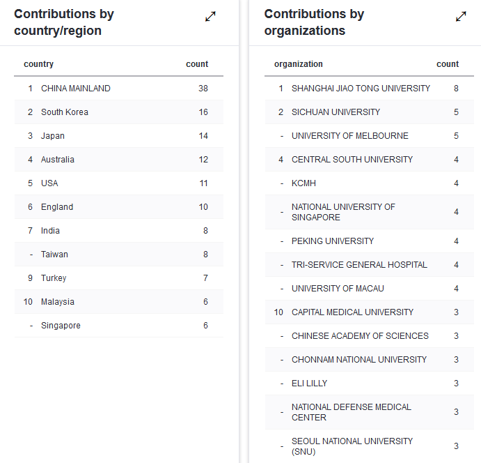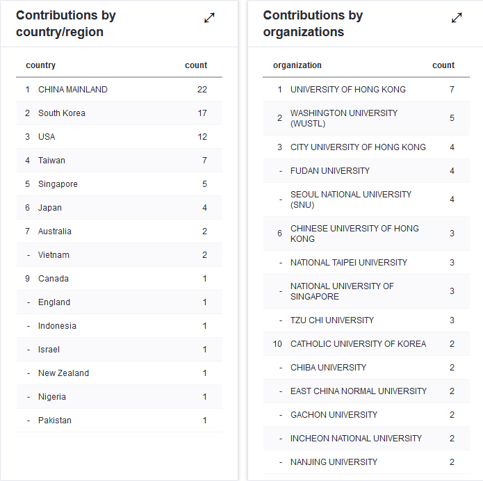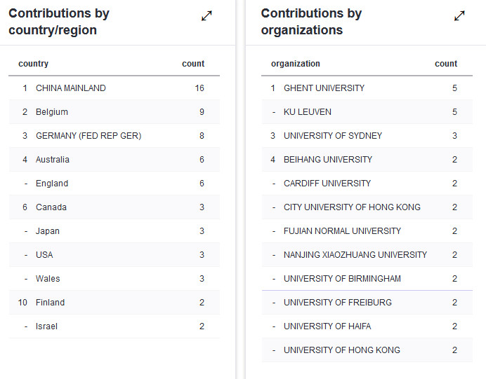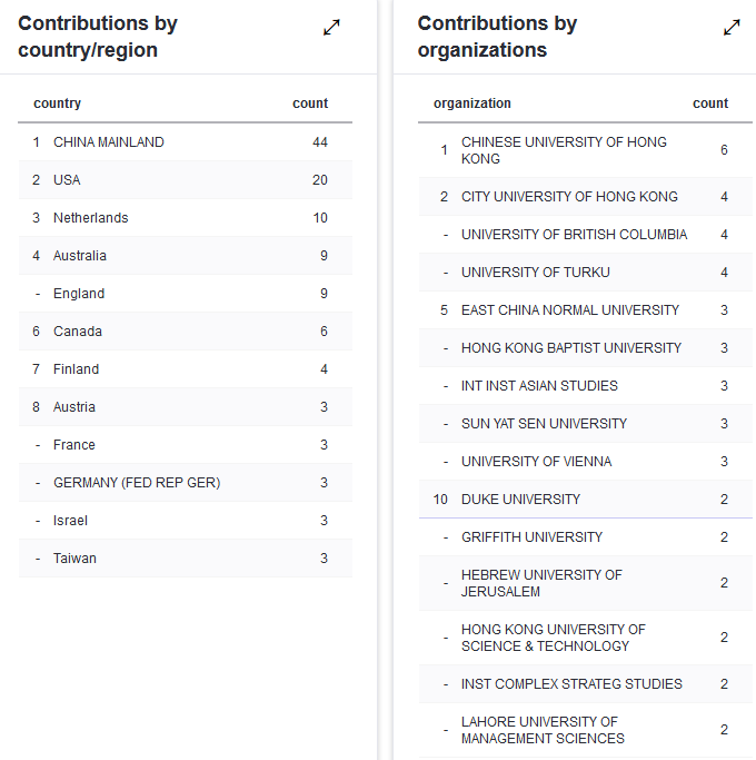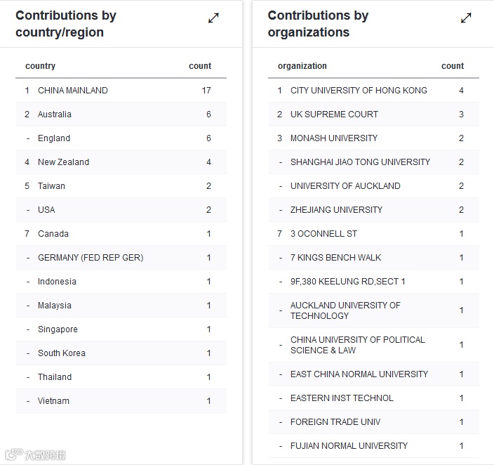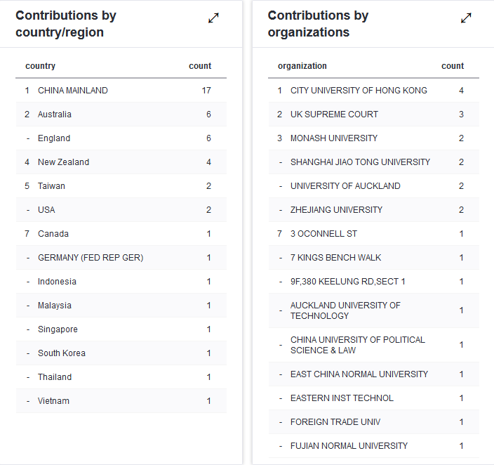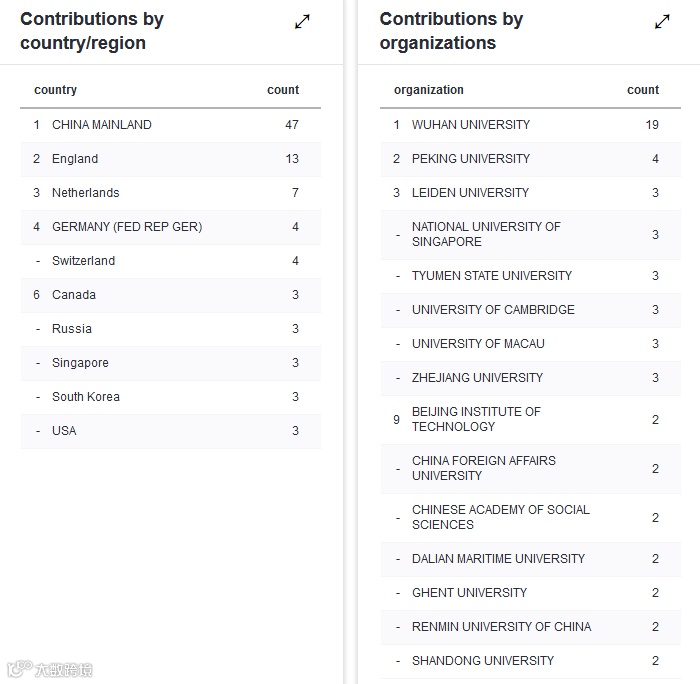 中国大陆地区是Chinese Journal of International Law刊文的首要来源地,武汉大学作为期刊的主办单位,在发文量上遥遥领先,发表记录排在前列的其他大陆地区机构还有北京大学、澳门大学、浙江大学、北京理工大学、外交学院、中国社会科学院、大连海事大学、中国人民大学、山东大学等。