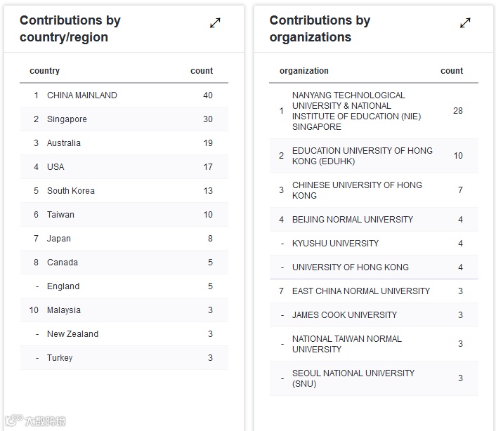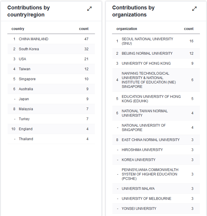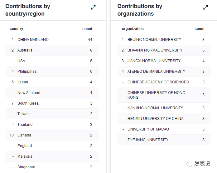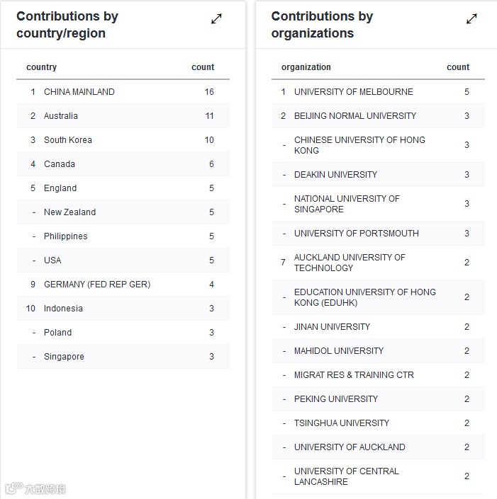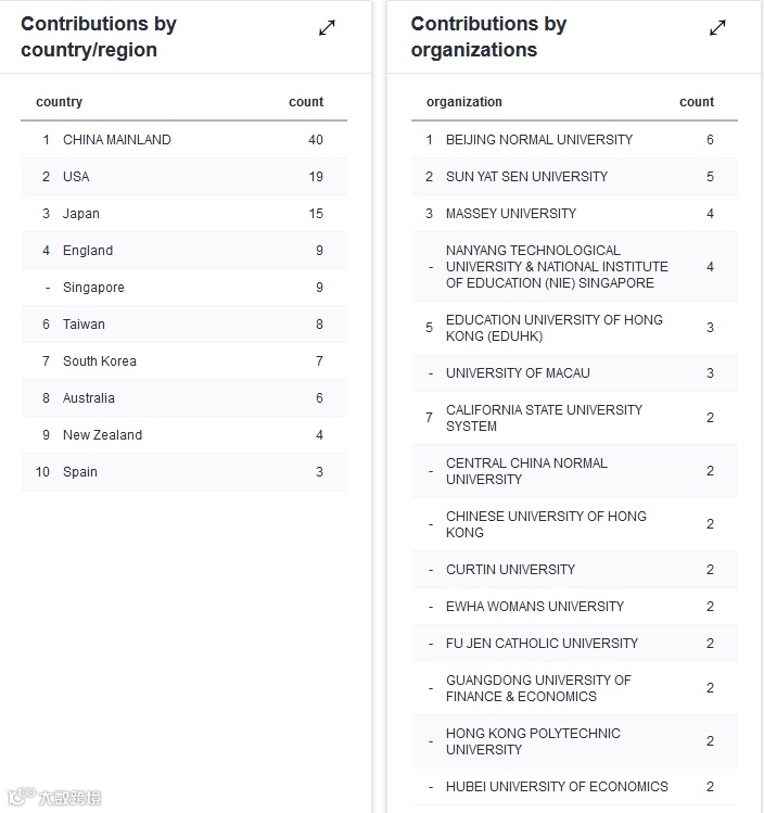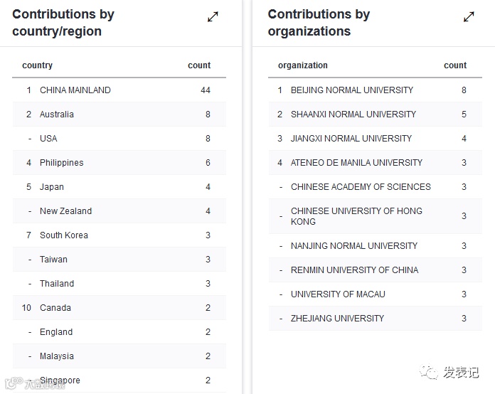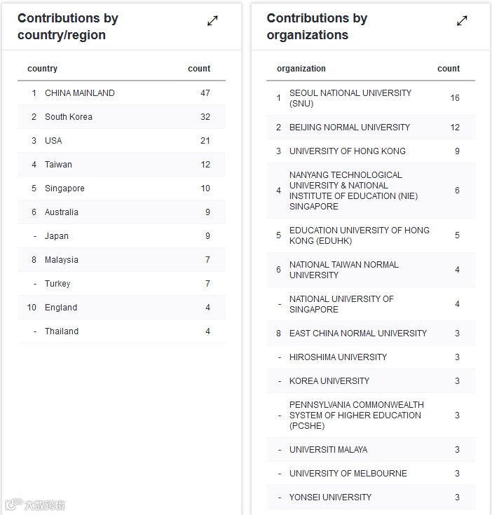 中国大陆地区力压韩国,是Asia Pacific Education Review刊文的首要来源地,北京师范大学、香港大学、香港教育大学、华东师范大学等高校在该刊上的发表记录排在前列。