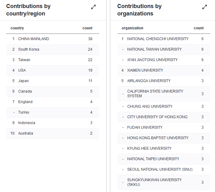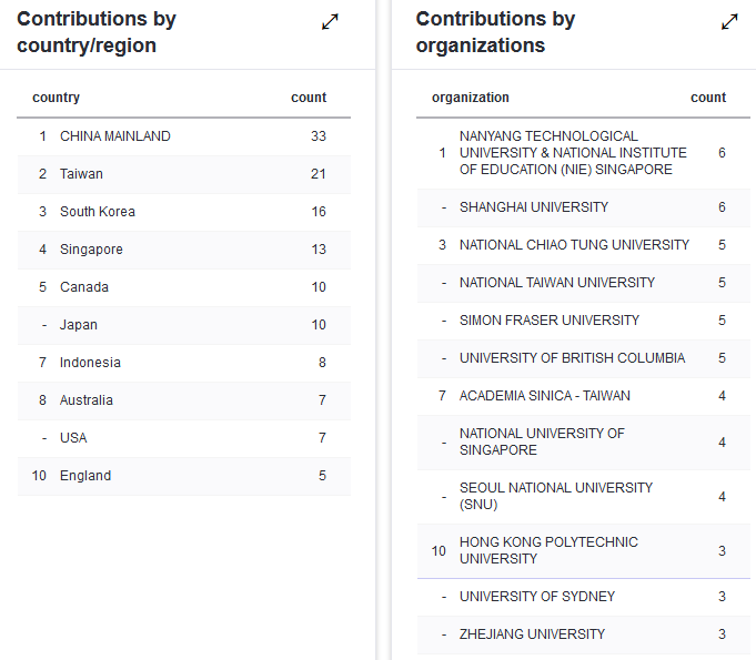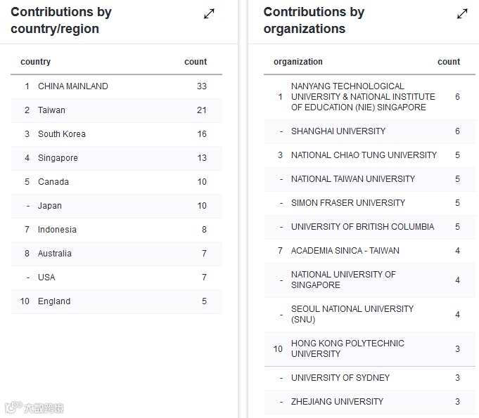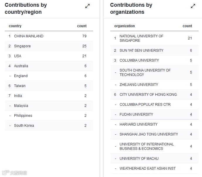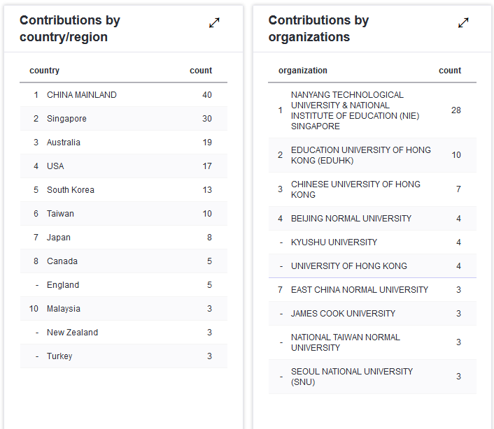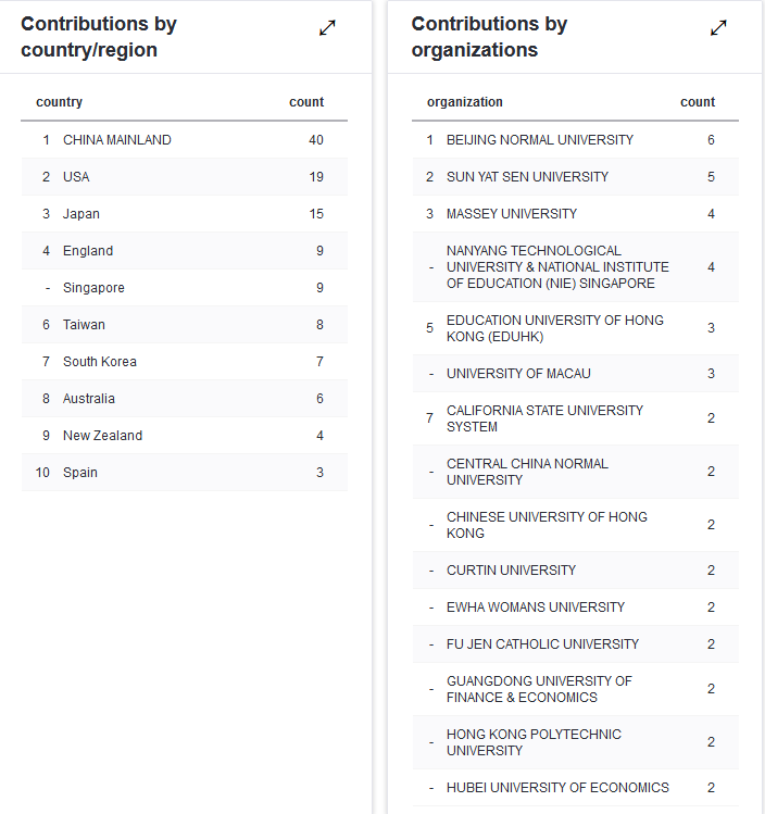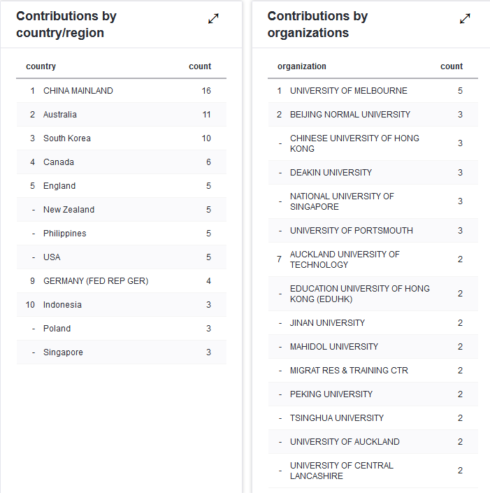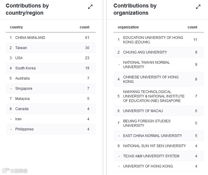 中国大陆地区力压韩国,是Asia Pacific Education Review刊文的首要来源地,北京师范大学、香港大学、香港教育大学、华东师范大学等高校在该刊上的发表记录排在前列。