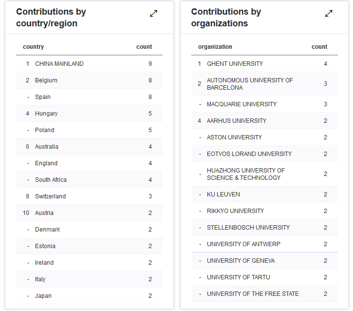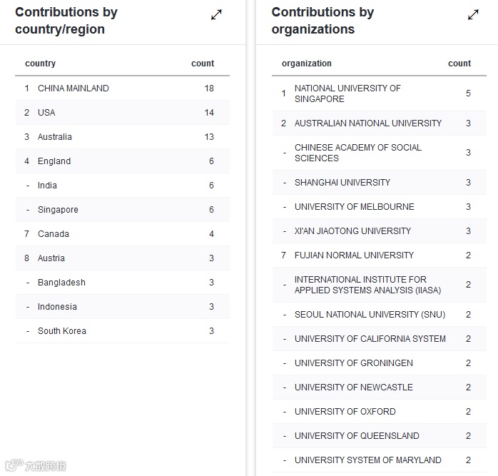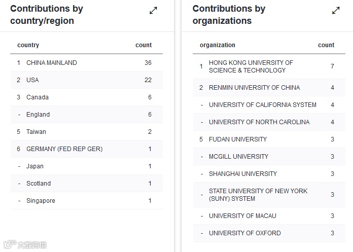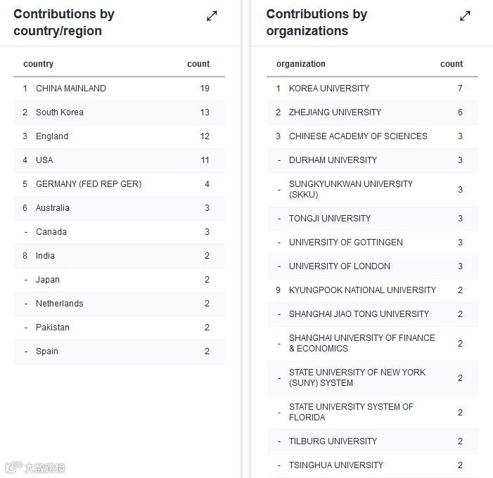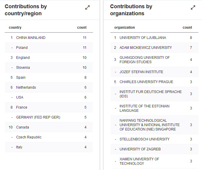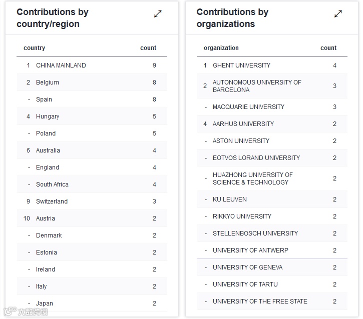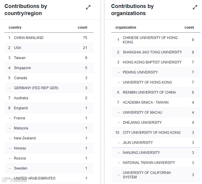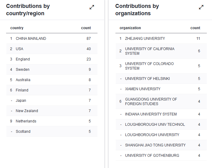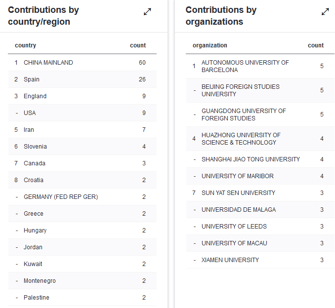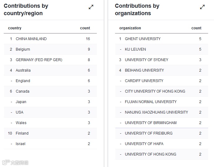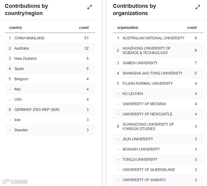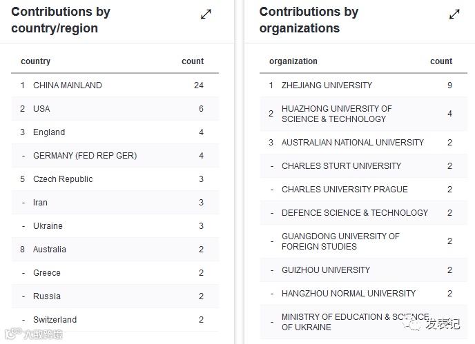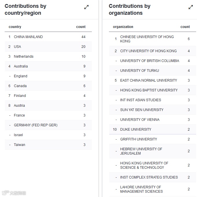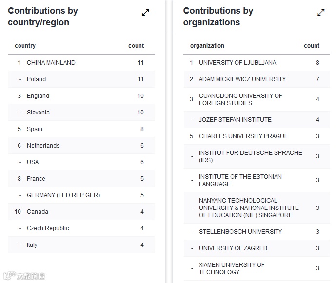 中国大陆地区和波兰并列为International Journal of Lexicography发文的首要来源地。广东外语外贸大学、厦门理工学院等中国大陆地区高校在该刊上的发表记录排在前列。