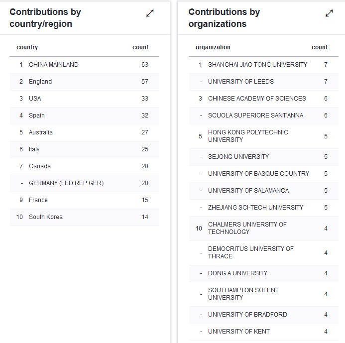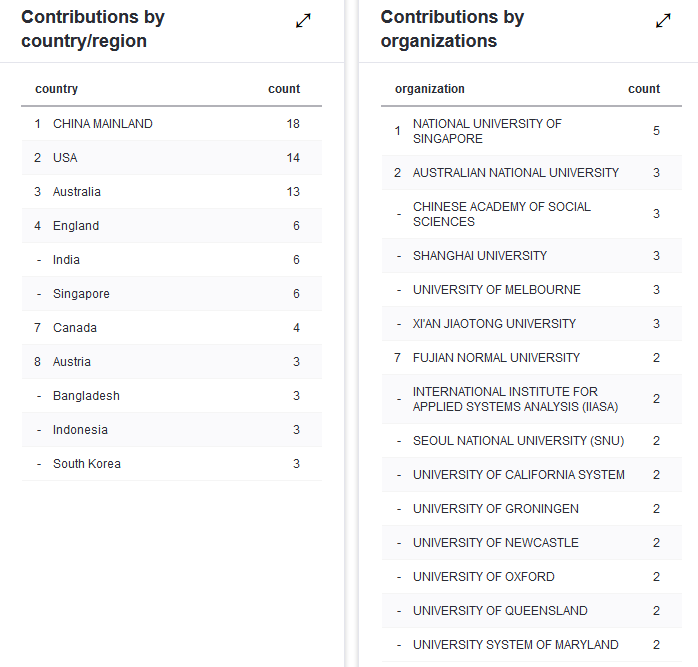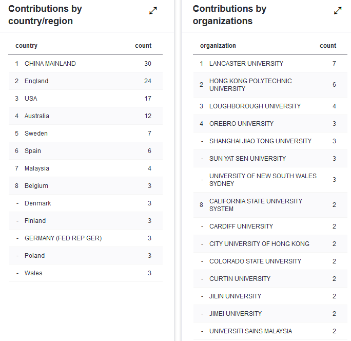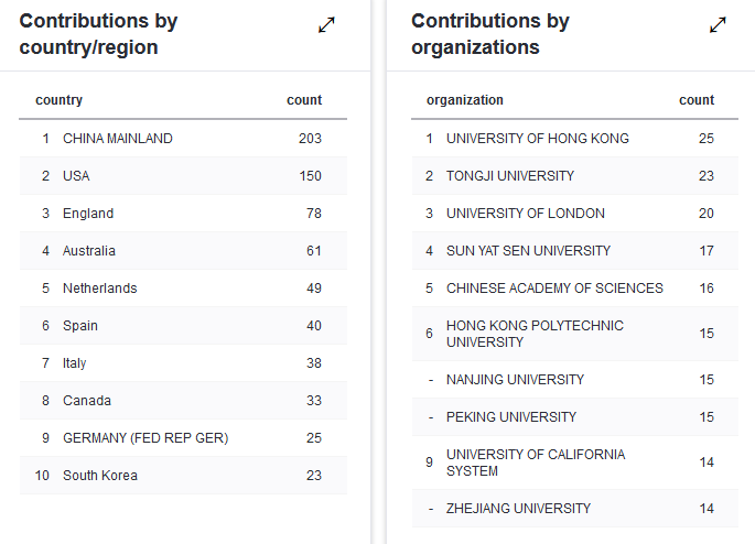 中国大陆地区是Cities刊文的首要来源地。期刊发文的前十大来源机构基本上被中国大陆地区高校和科研机构包揽,包括香港大学、同济大学、中山大学、中国科学院、香港理工大学、南京大学、北京大学、浙江大学等。