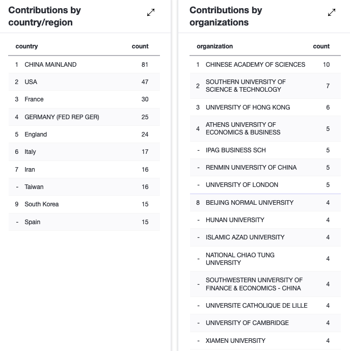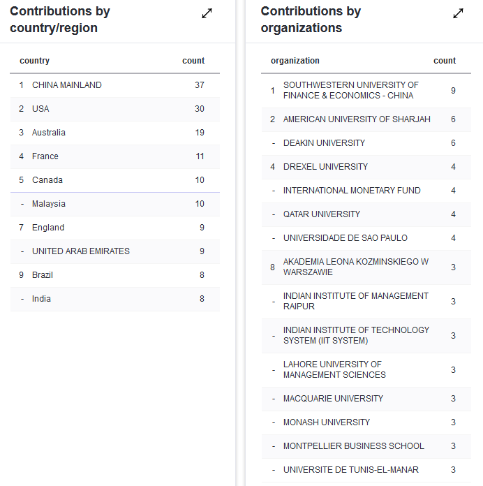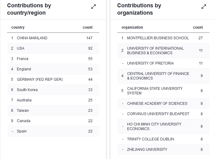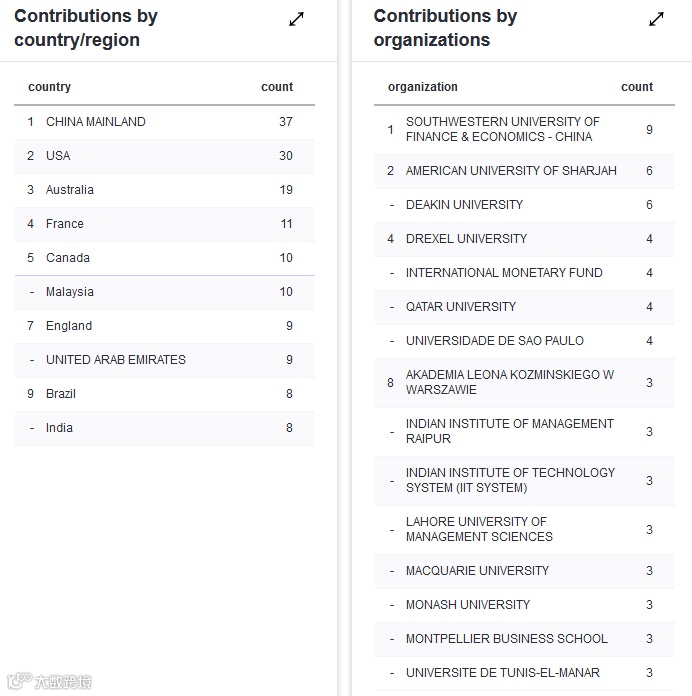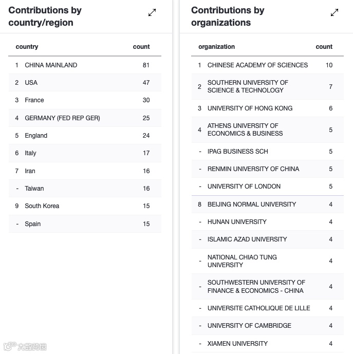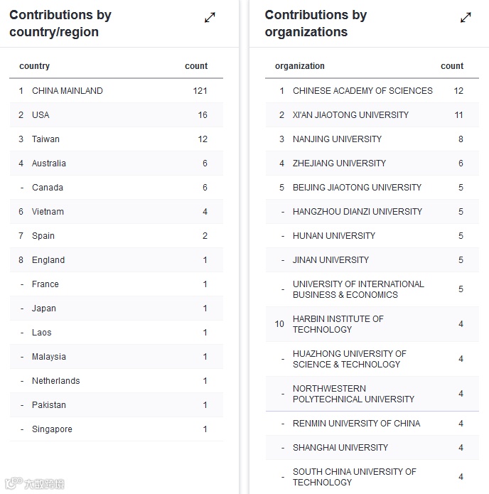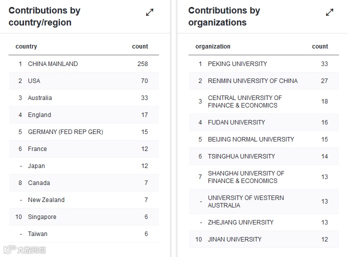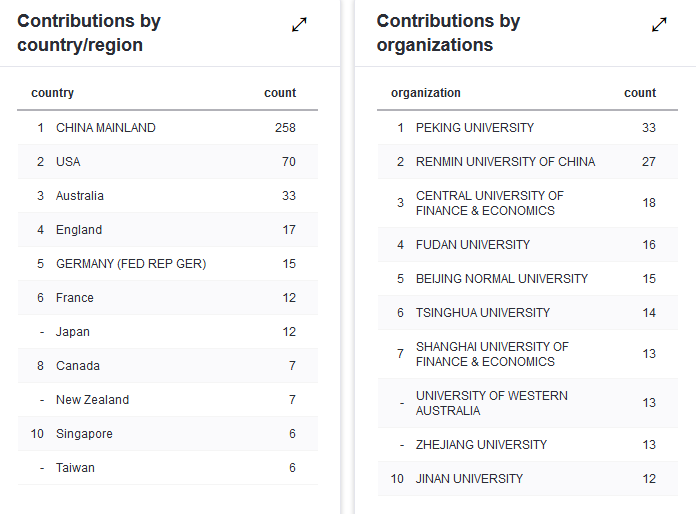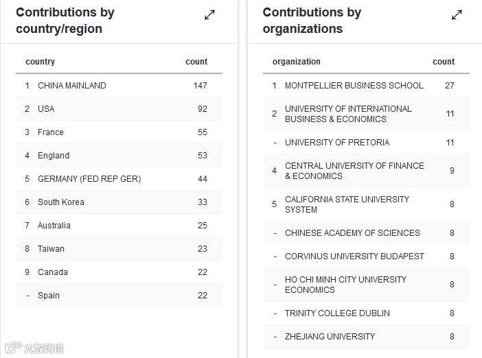 中国大陆地区是Finance Research Letters发文的首要来源地。对外经济贸易大学、中央财经大学、中国科学院、浙江大学等中国大陆地区高校和研究机构在该刊上的发表记录排在前列。