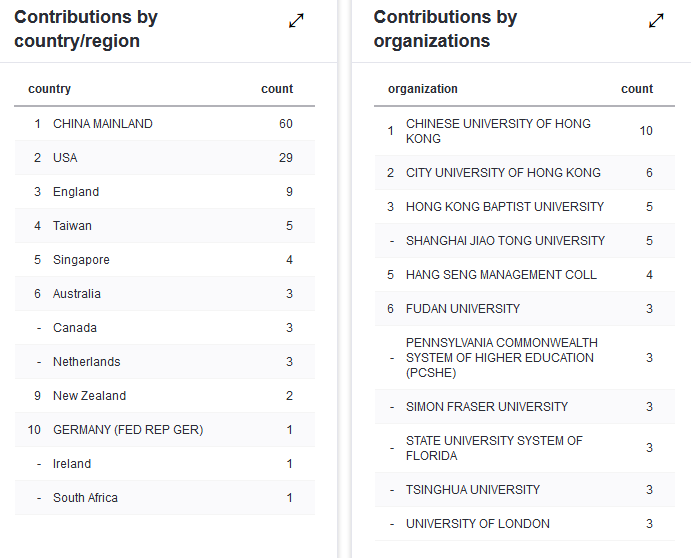 中国大陆地区为Chinese Sociological Review刊文的首要来源地。香港科技大学、中国人民大学、复旦大学、上海大学、澳门大学等高校在该刊上的发表记录排在前列。