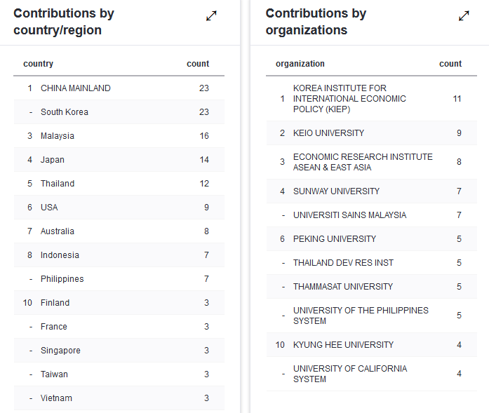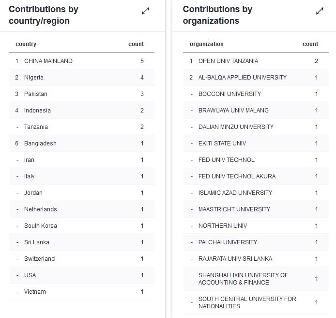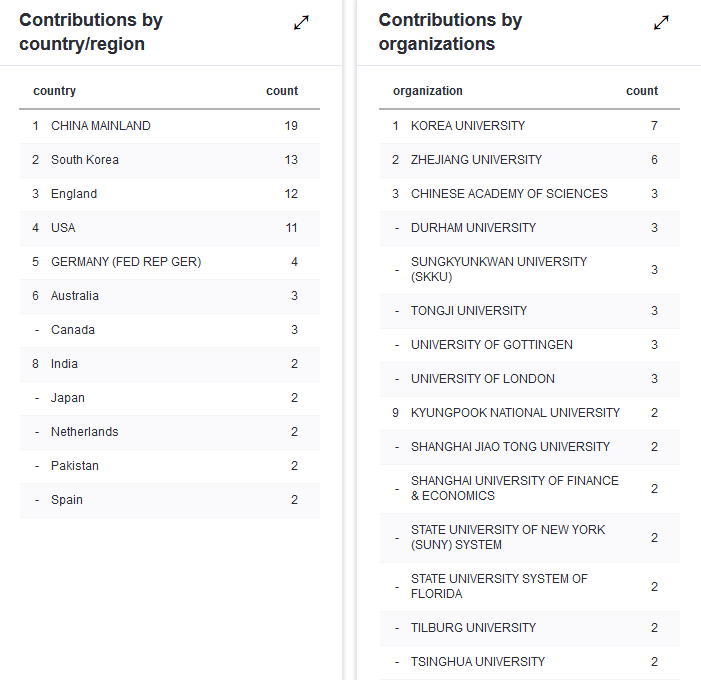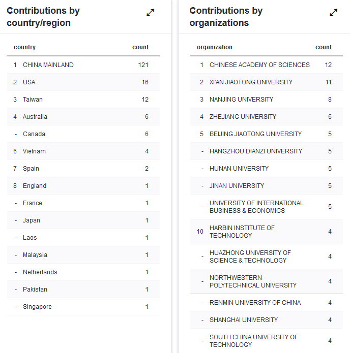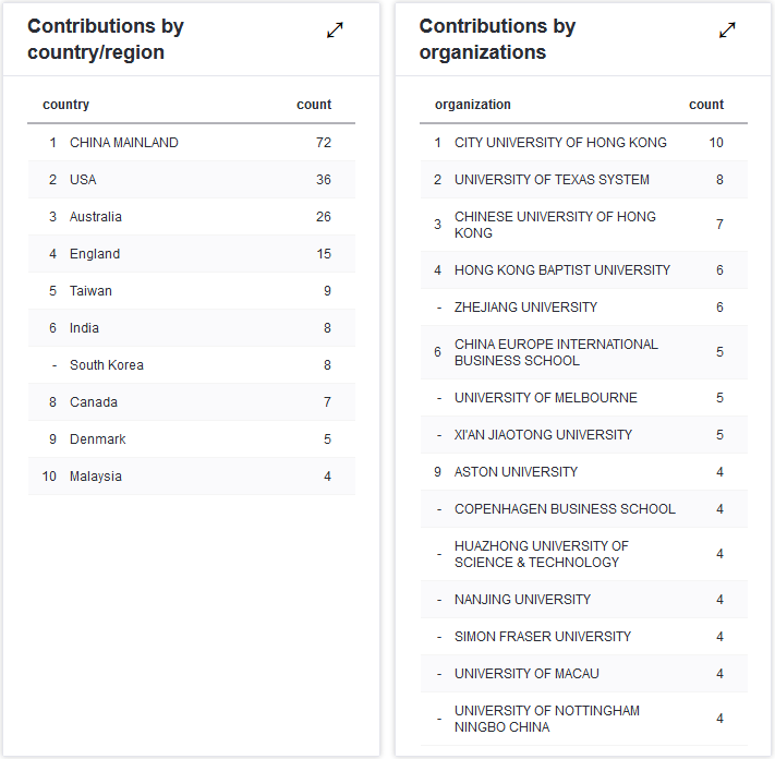 中国大陆地区是Chinese Management Studies发文的首要来源地。期刊发文的前十大来源机构基本上被中国大陆地区高校和科研院所包揽,包括中国科学院、西安交通大学、南京大学、浙江大学、北京交通大学、杭州电子科技大学、湖南大学、暨南大学、对外经济贸易大学、哈尔滨工业大学、华中科技大学、西北工业大学、中国人民大学、上海大学、华南理工大学等。