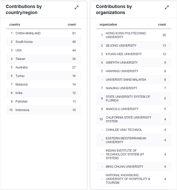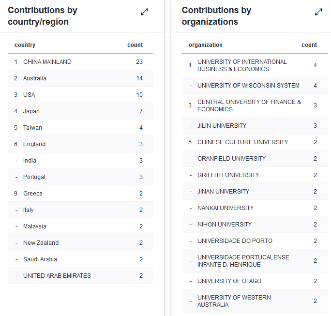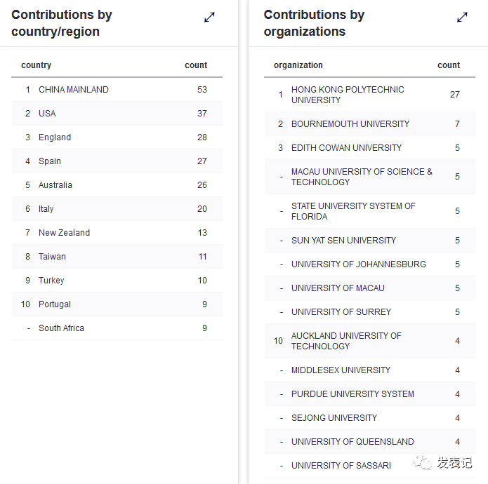 中国大陆地区是International Journal of Tourism Research刊文的首要来源地。香港理工大学、澳门科技大学、中山大学、澳门大学等中国大陆地区高校在该刊上的发表记录排在前列。