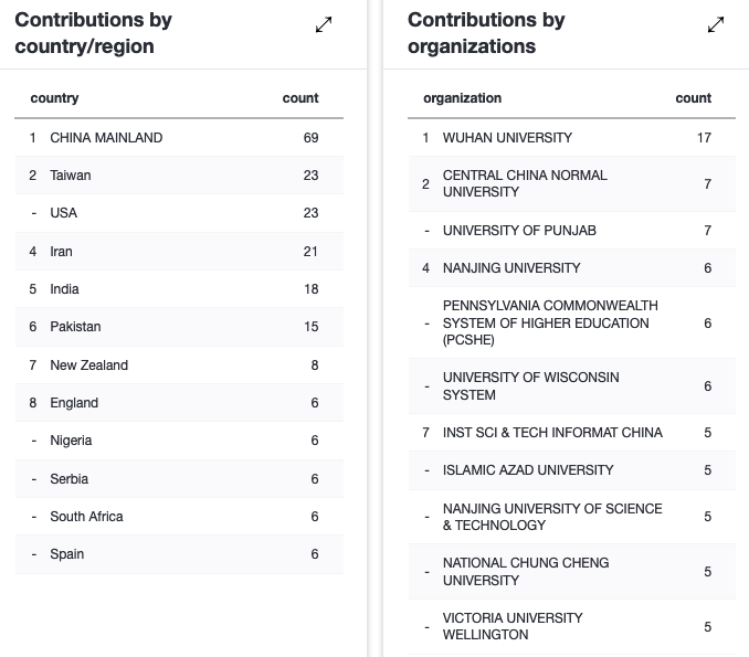 中国大陆地区是Electronic Library发文的首要来源地。武汉大学、华中师范大学、南京大学、南京理工大学等中国大陆地区高校在该刊上的发表记录排在前列。