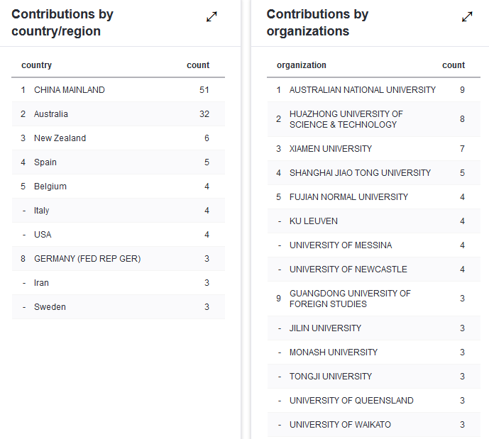 中国大陆地区是Functions of Language发文的首要来源地。北京航空航天大学、香港城市大学、福建师范大学、南京晓庄学院、香港大学等中国大陆地区高校和研究机构在该刊上的发表记录排在前列。