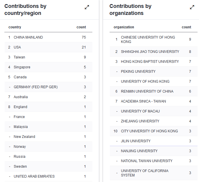 中国大陆地区为Chinese Journal of Communication刊文的首要来源地,香港中文大学、香港城市大学、香港浸会大学、上海交通大学、复旦大学、清华大学等高校在该刊上的发表记录排在前列。