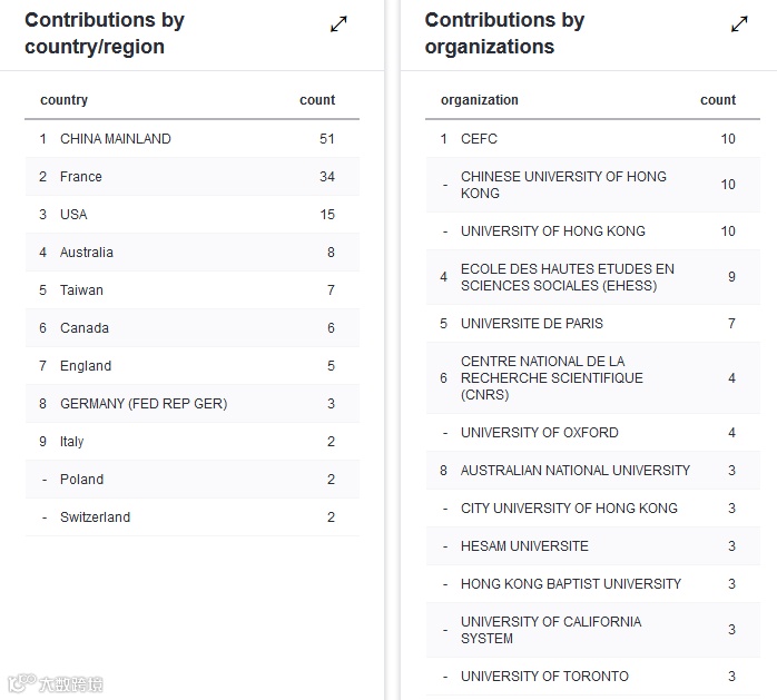 中国大陆地区是China Review-An Interdisciplinary Journal on Greater China刊文的首要来源地,期刊发文的前十大来源机构基本上被中国大陆地区高校包揽,包括香港中文大学、上海交通大学、香港浸会大学、北京大学、香港大学、中国人民大学、澳门大学、浙江大学等。