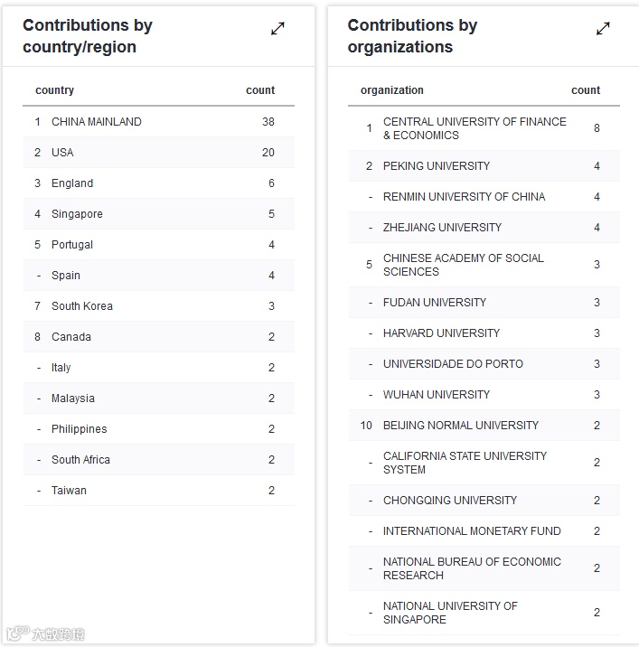 中国大陆地区是Annals of Economics and Finance发文的首要来源地,中央财经大学、北京大学、中国人民大学、浙江大学、中国社会科学院、复旦大学、武汉大学等高校和科研机构在该刊上的发表记录排在前列。