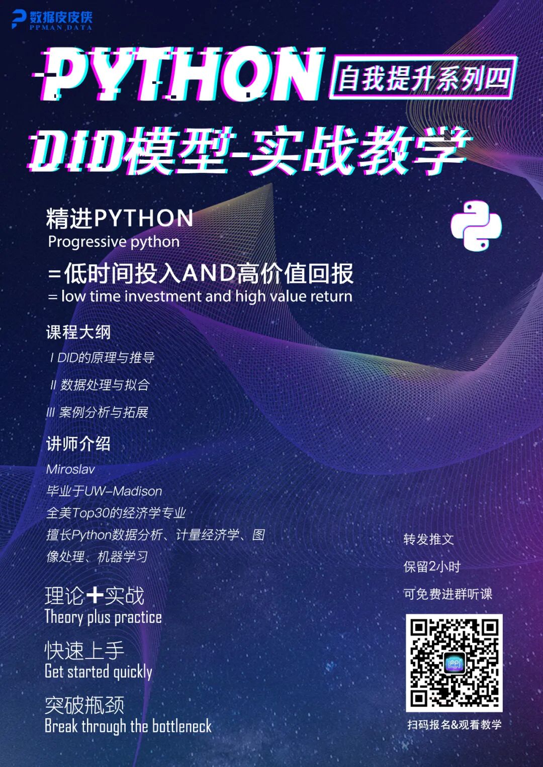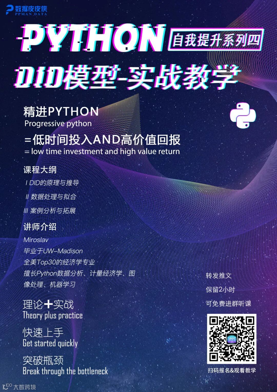 本次课程将会围绕python数据分析、DID模型,结合理论和实战案例,为大家详细讲解其中的奥秘!只需按照报名要求即可免费、免费、免费参与!