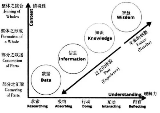 四、智慧。 智慧是知识层次中的最高一级。它同时也是人类区别于其他生物的重要特征。我们经常看到一个人满腹经纶,拥有很多知识,但不通世故,被称做书呆子。也会看到有些人只读过很少的书,却能力超群,能够解决棘手的问题。我们会认为后者具有更多的智慧。智慧(Wisdom) -知识的选择(Selection)应对的行动方案可能有多种,但(战略)选择哪个靠智慧。智慧是人类基于已有的知识,针对物质世界运动过程中产生的问题根据获得的信息进行分析,对比,演绎找出解决方案的能力。