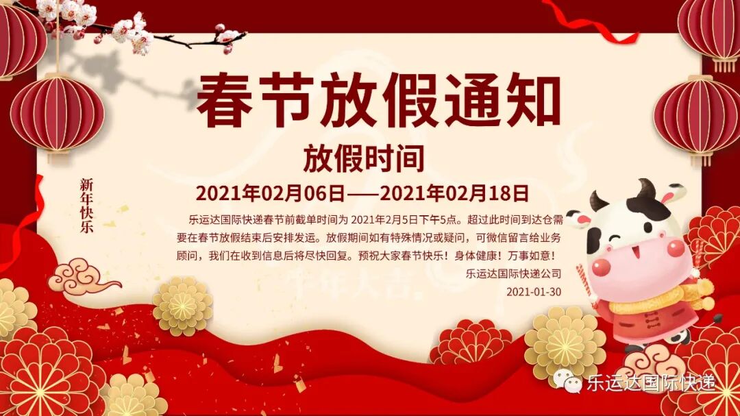 乐运达国际快递春节前截单时间为 2021年2月5日下午5点。超过此时间到达仓库的包裹,需要在春节放假结束后安排发运。