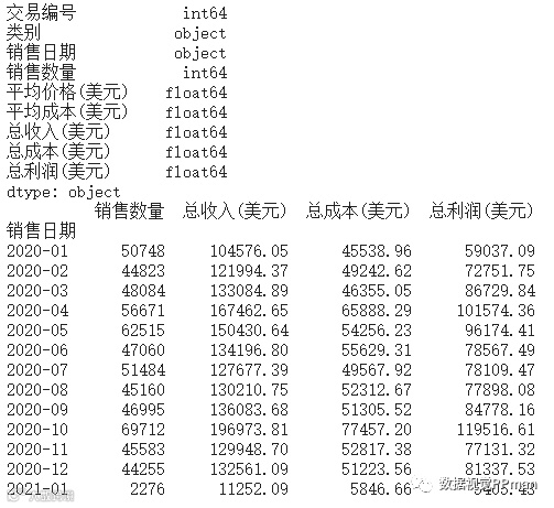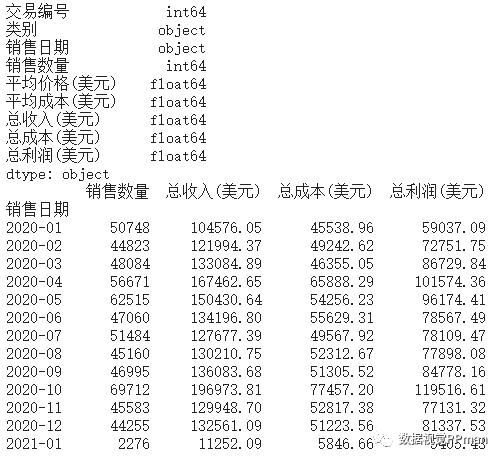 gb_date_sold = df.groupby(df["销售日期"].dt.to_period('m')).sum()[["销售数量", '总收入(美元)', '总成本(美元)', "总利润(美元)"]]