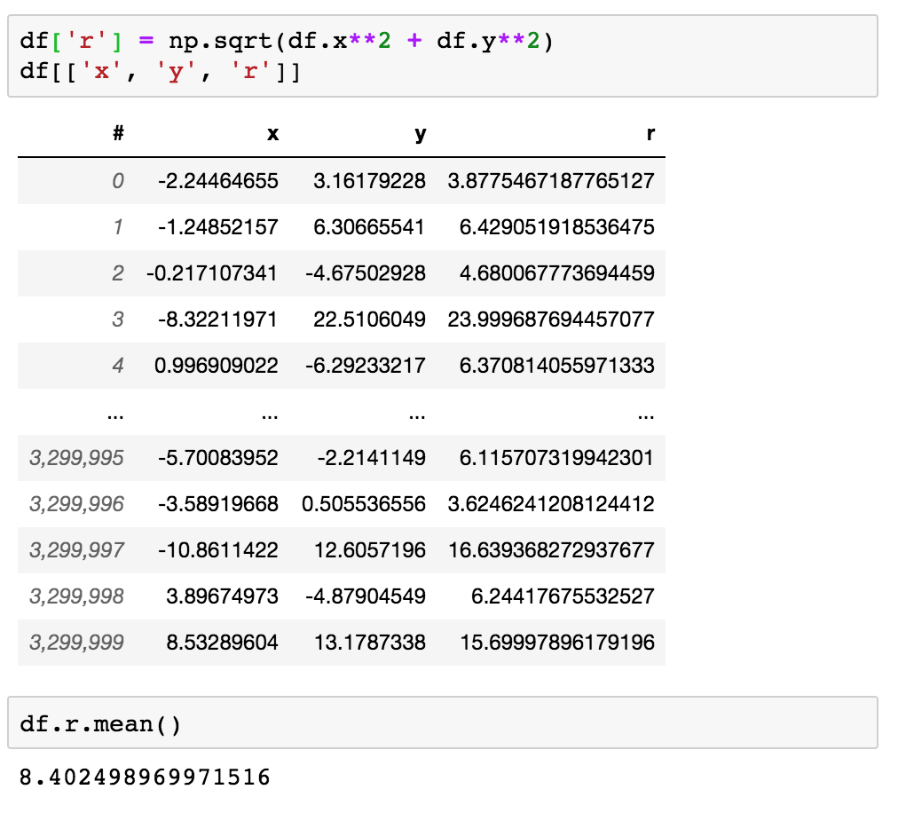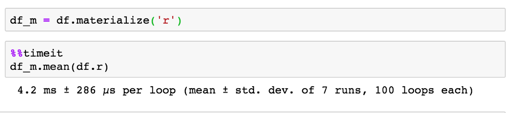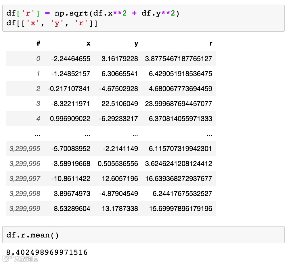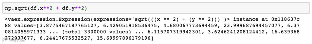 我们还可以将表达式添加到DataFrame中,从而生成虚拟列。虚拟列的行为类似于常规列,但不占用任何内存。Vaex在实列和虚列之间没有区别,