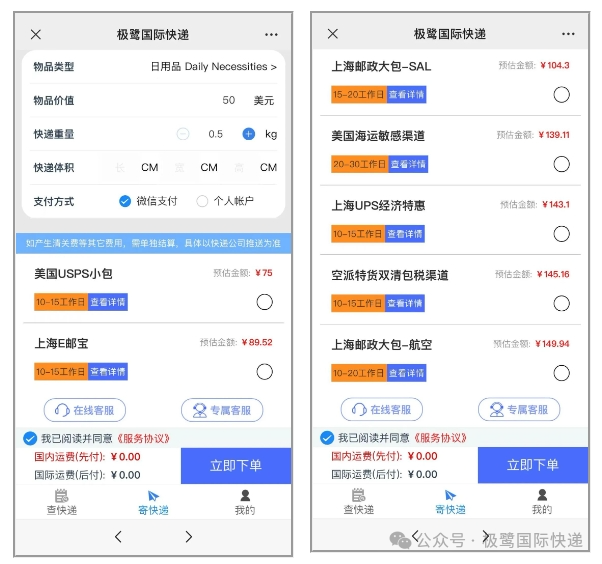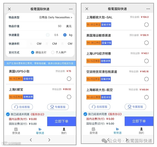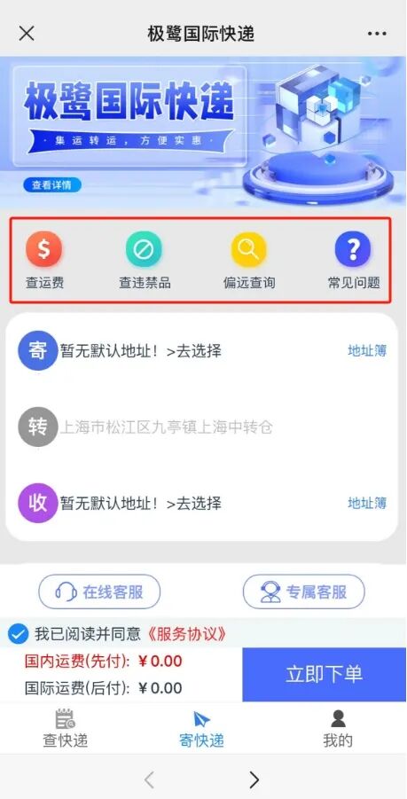 1、进入“极鹭国际快递”公众号或者小程序,点击“寄快递”;