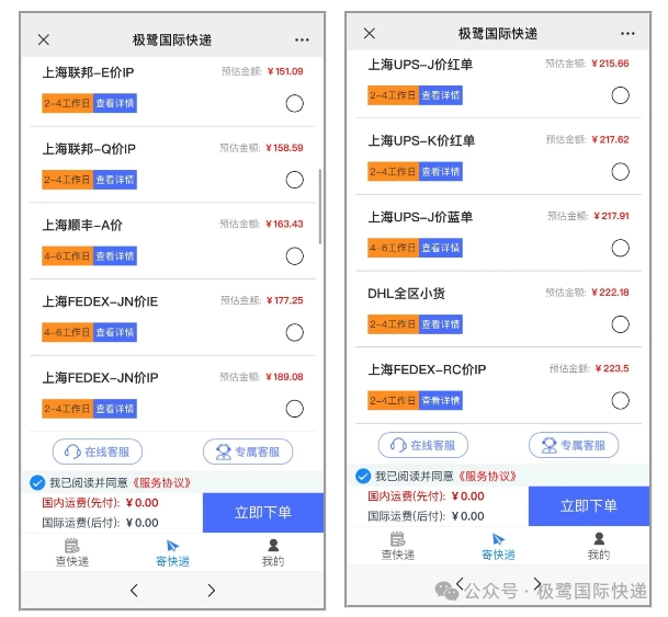 极鹭国际快递运费普遍比快递官网优惠2-3折!快递渠道很多,越重越划算!大家都可以去对比下相应的快递官网,看看差距。