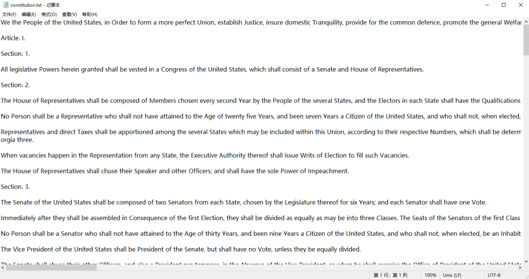 这里我们使用到来自wordcloud官方文档中的constitution.txt来作为可视化的数据素材: