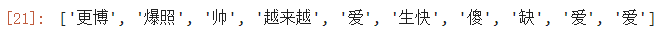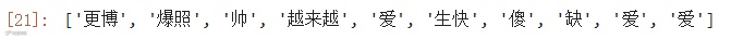 weibo_text = [word for word in jieba.cut(' '.join(re.findall('[\u4e00-\u9fa5]+', ' '.join(weibo['review'].tolist())))) if word != ' ' and word not in stopwords]