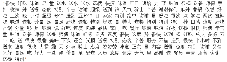 相较于英文文本语料,中文语料处理起来要麻烦一些,我们需要先进行分词等预处理才能进行下一步的处理,这里我们使用某外卖平台用户评论数据,先读取进来看看: