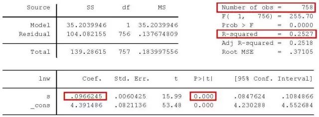 在上图的回归结果中,变量 s (教育年限) 的回归系数符号为正 (与经济理论相符),系数估计值为 0.0966245, p 值为 0.000 (在 1% 水平上具有统计显著性),样本容量为 758,而拟合优度 为 0.2527 (教育年限可解释工资对数约四分之一的变动)。在上图中,左上角的残差平方和、右下角的置信区间,乃至常数项等信息,基本可以不关心 (除非有需要)。
