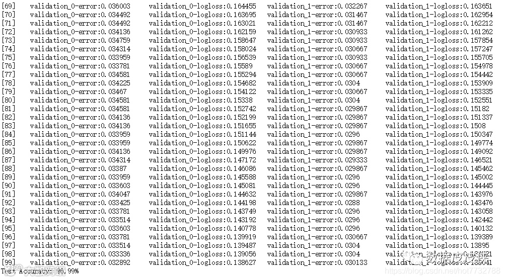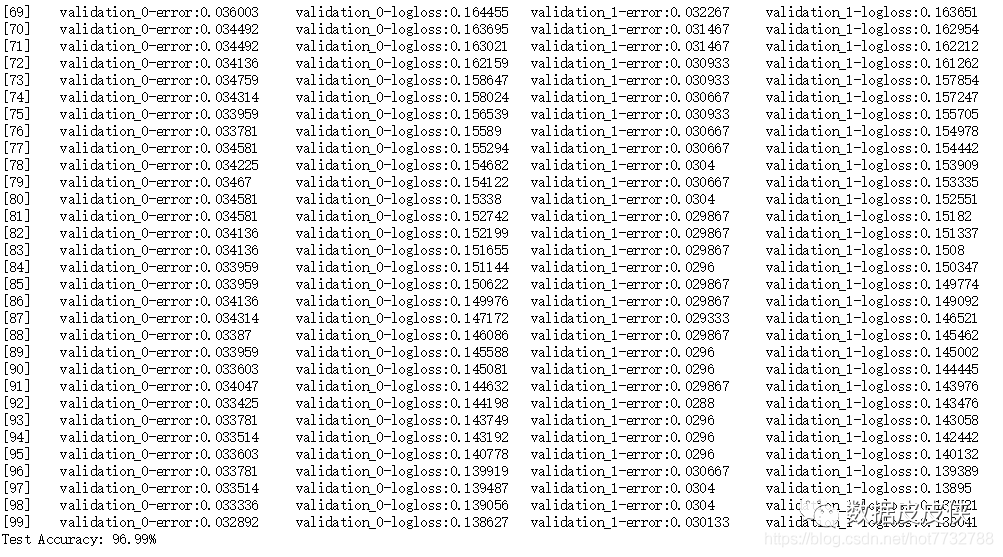 bst.fit(f_train, l_train, early_stopping_rounds=10, eval_metric="error",eval_set=eval_set, verbose=True) #early_stopping_rounds--当多少次的效果差不多时停止 eval_set--用于显示损失率的数据 verbose--显示错误率的变化过程