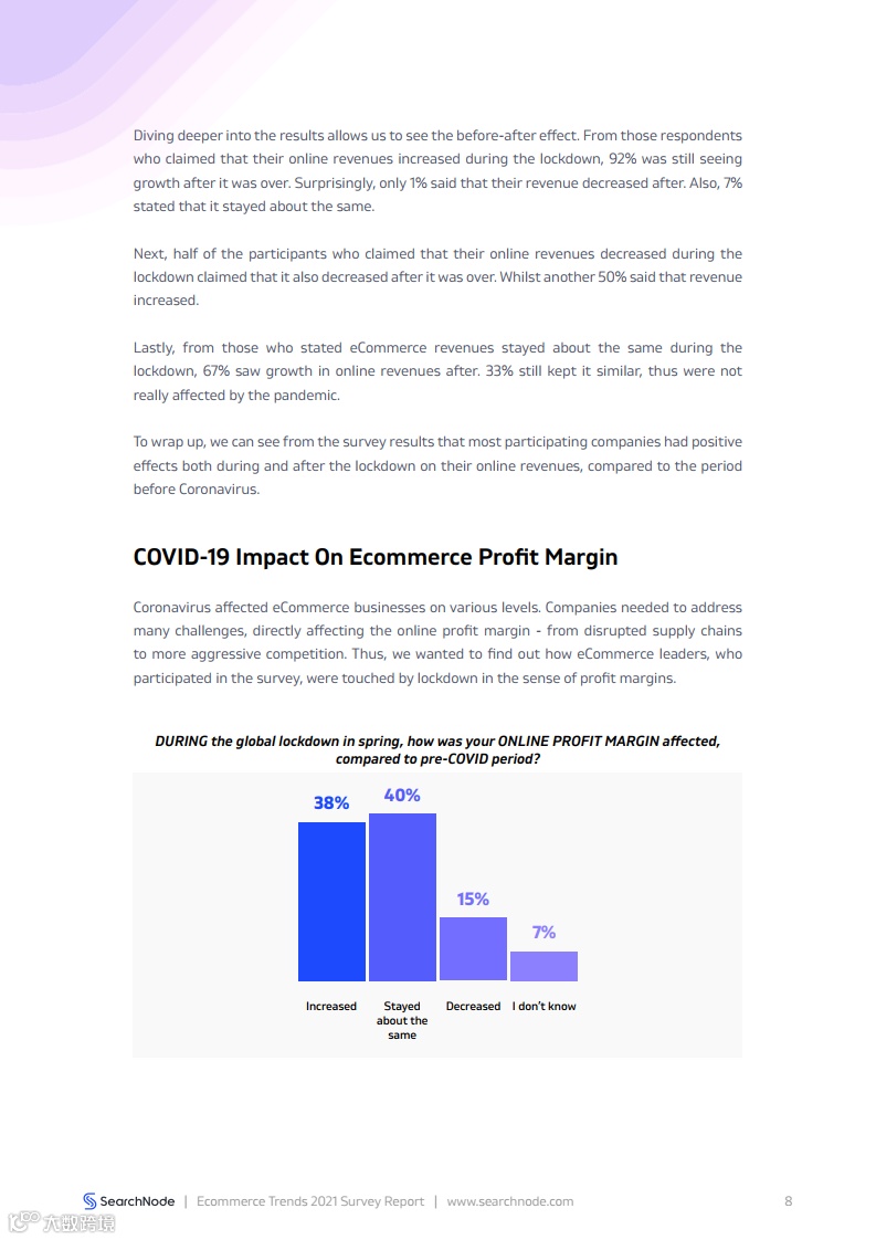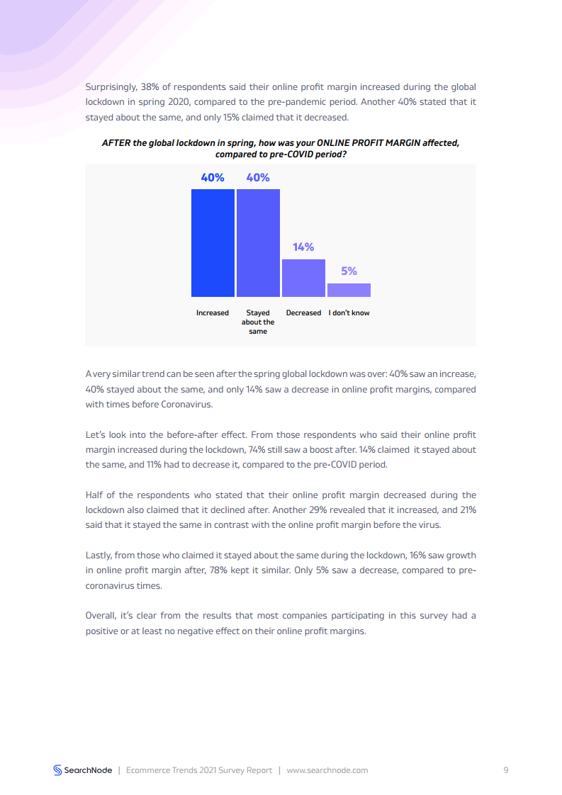 40%的受访者表示,他们在2020年春季全球封锁期间的在线利润率与大流行前相比有所增加;只有15%的受访者表示利润率有所下降;